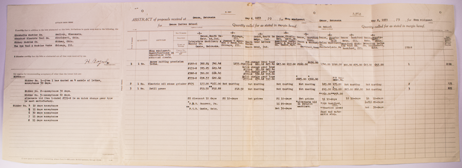This document lists bids from open market companies on shop equipment in accordance with attached specifics sheet.