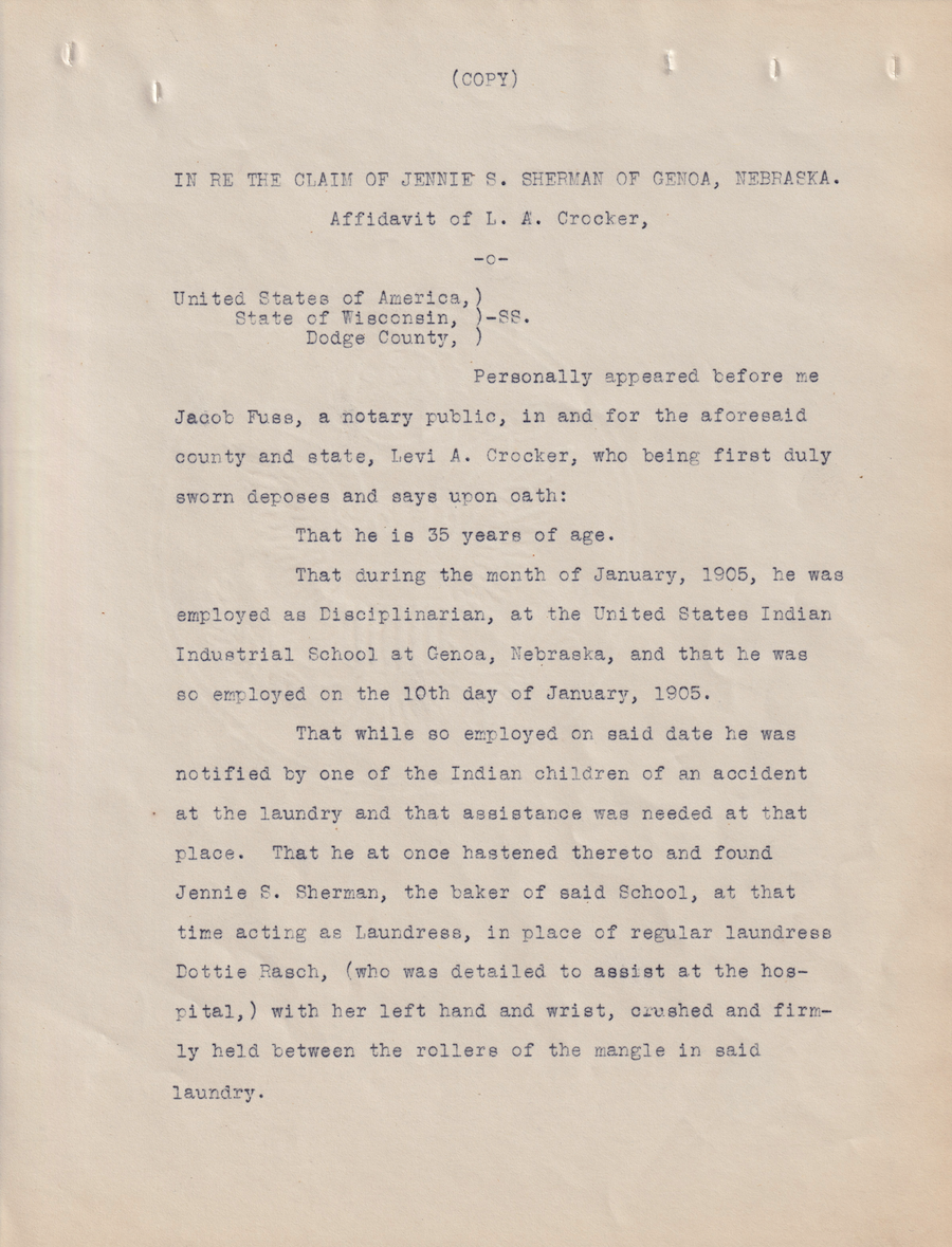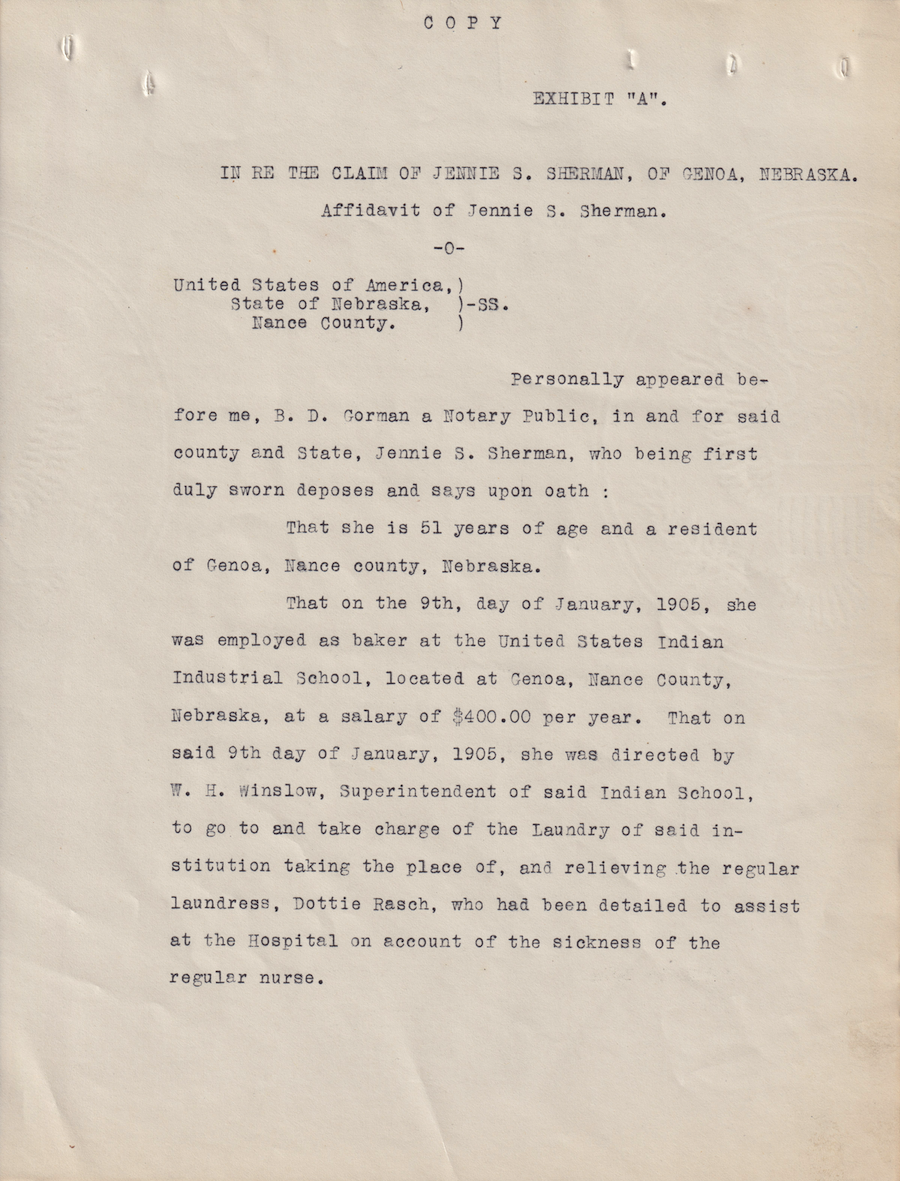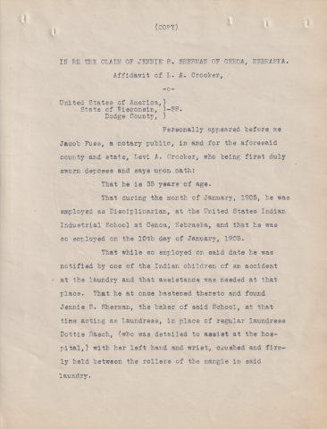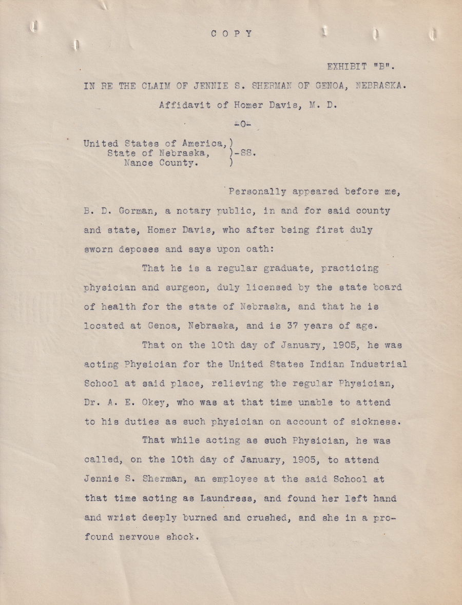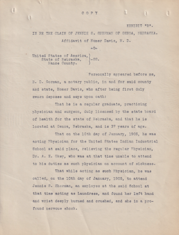 Affidavit of Jennie S. Sherman, Homer Davis, and Levi A. Crocker, undated; Folder: 53726-1912-732, Box 19; Central Classified Files, 1907–1939 (NAID 300324); Office of Indian Affairs; Record Group 75; National Archives and Records Administration-Washington, DC.