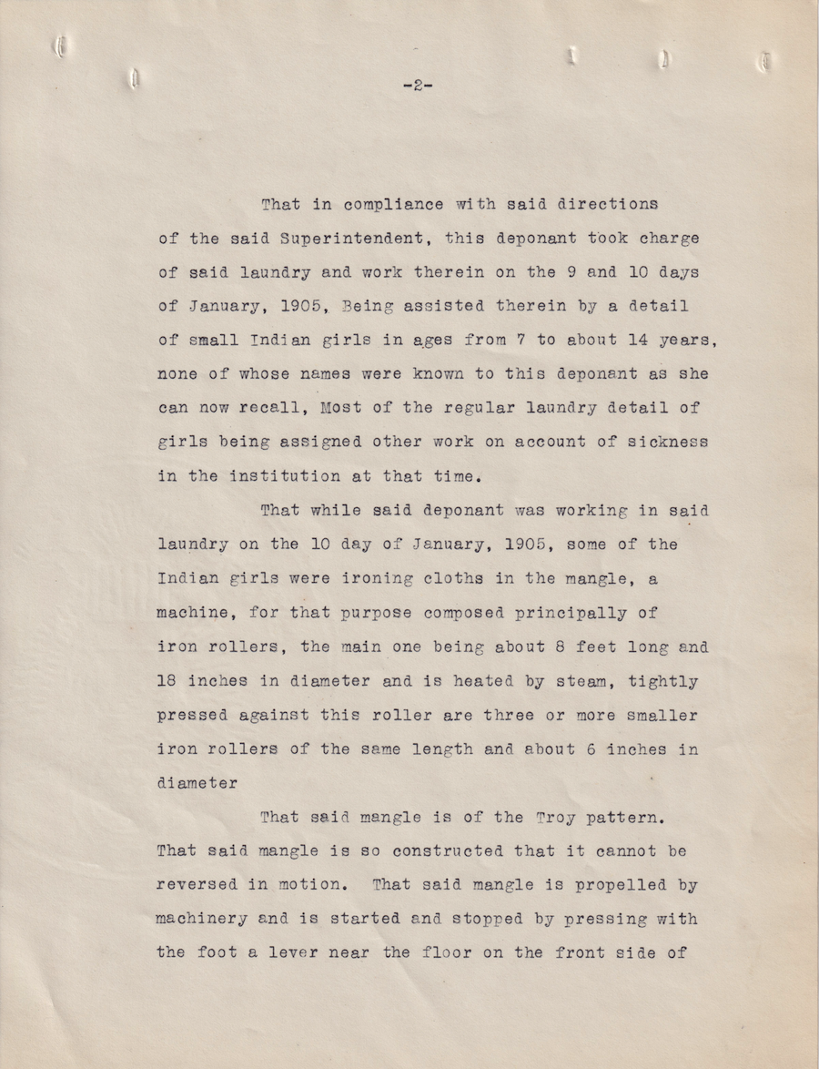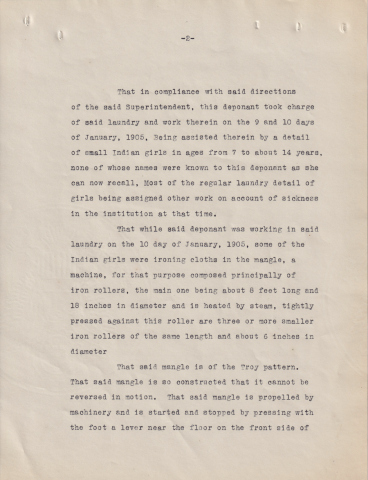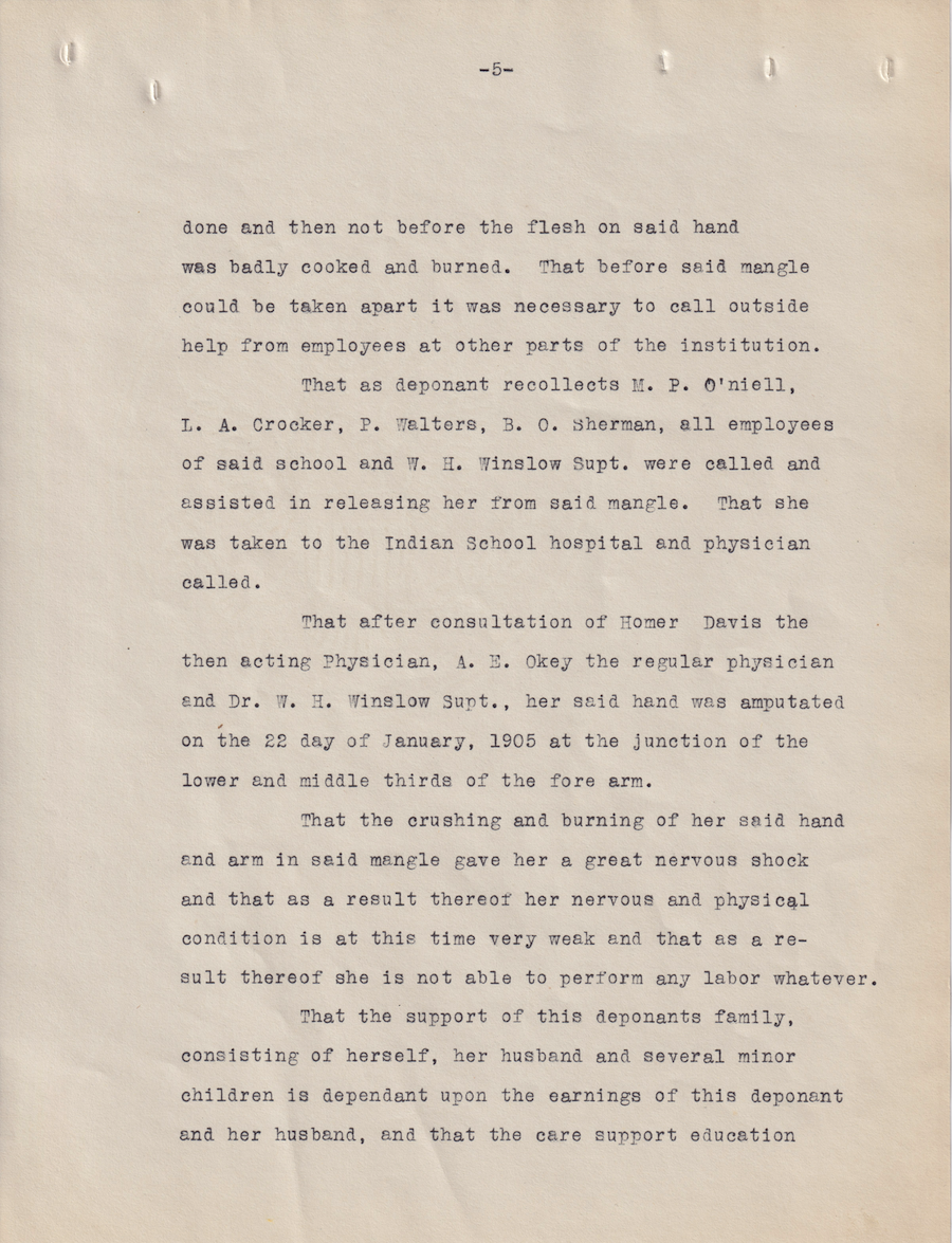 According to Sherman, her hand was crushed in the mangle due to a young student accidentally pressing on the control foot while she tried to untangle clothing that was stuck in the rollers. Her hand was burned and crushed for 20 minutes until the disciplinarian was able to assist. Her arm was later amputated by local physicians.