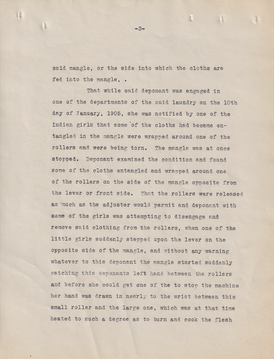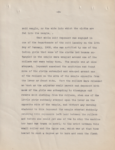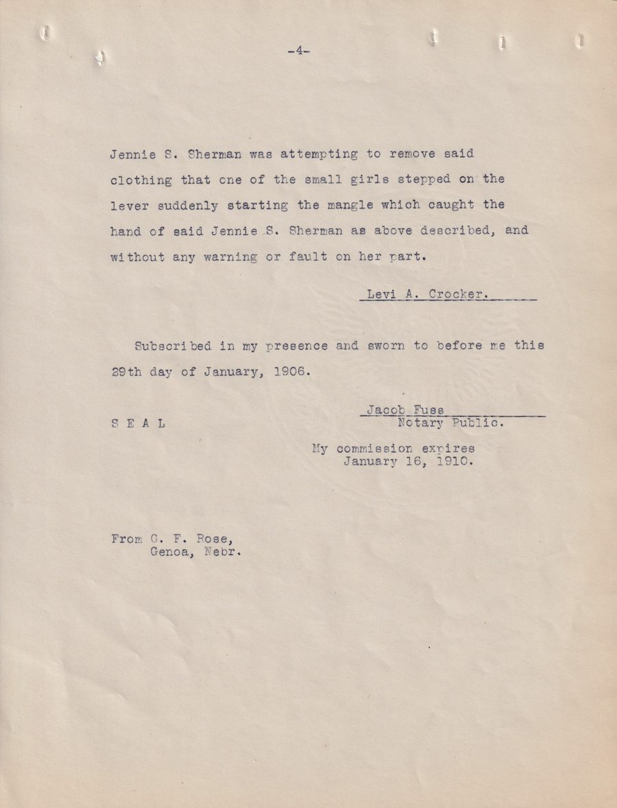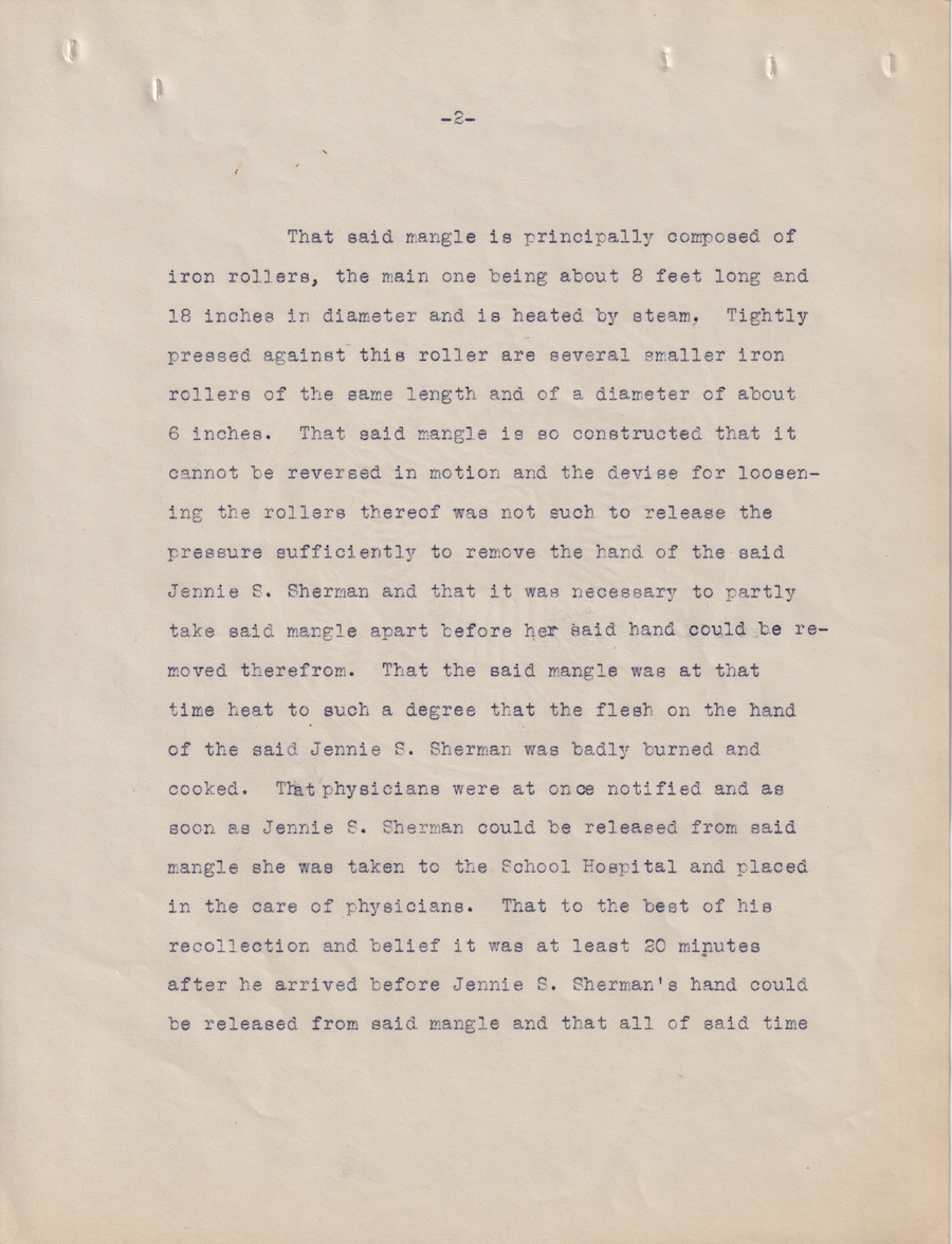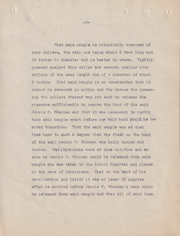 Regarding an accident in a laundry mangle causing Jennie S. Sherman's hand and wrist to sustain severe burns and injuries.Description: