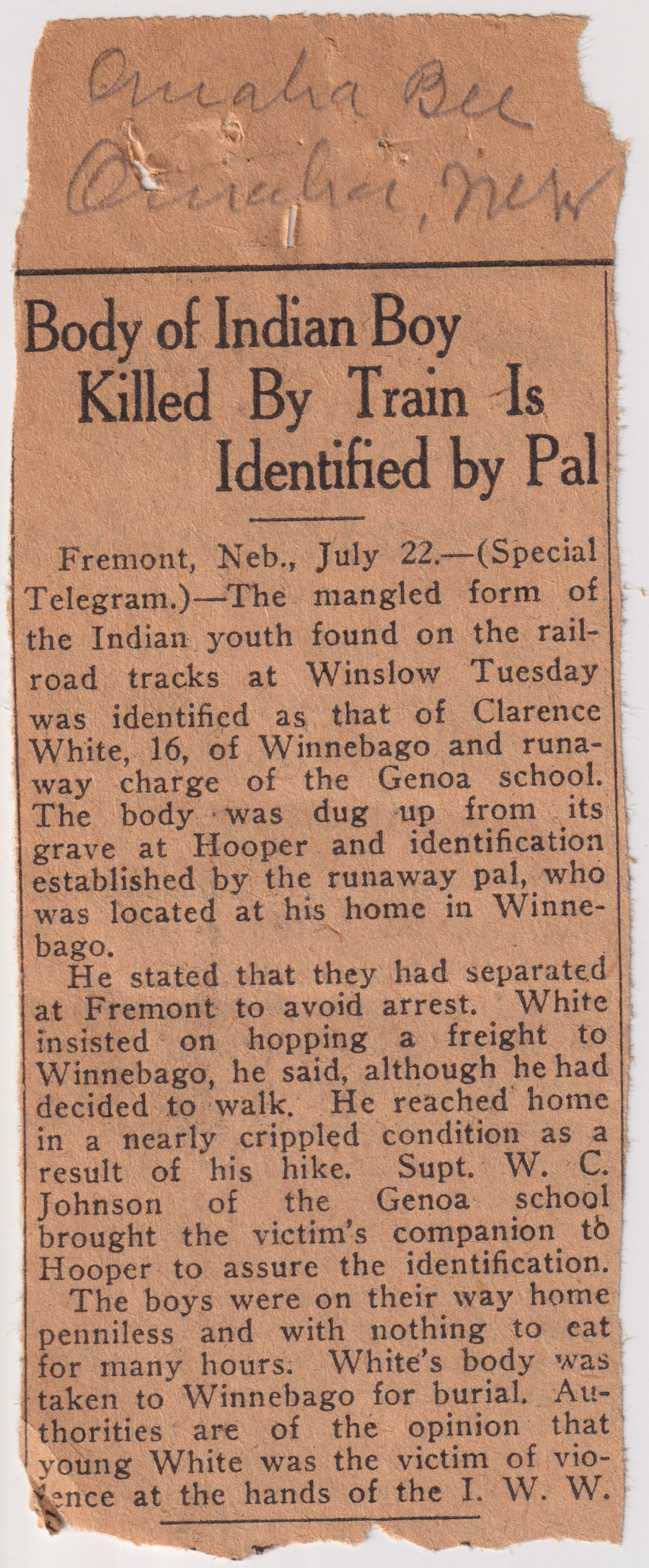 Clipping from the Omaha Bee, 22 July 1921; Folder: 61557-1921-736, Box 20; Central Classified Files, 1907–1939 (NAID 300324); Office of Indian Affairs; Record Group 75; National Archives and Records Administration-Washington, DC.