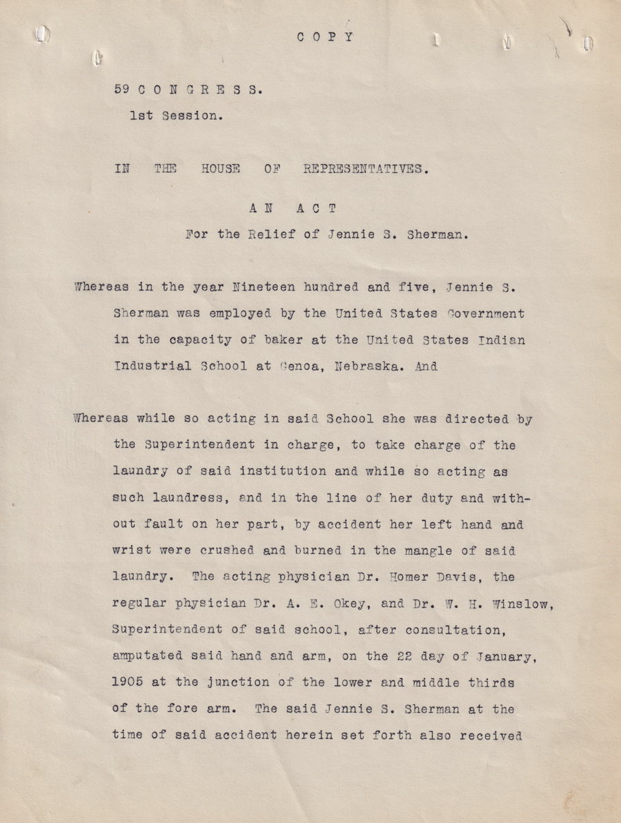 An Act for the relief of Jennie S. Sherman, undated; Folder: 53726-1912-732, Box 19; Central Classified Files, 1907–1939 (NAID 300324); Office of Indian Affairs; Record Group 75; National Archives and Records Administration-Washington, DC.