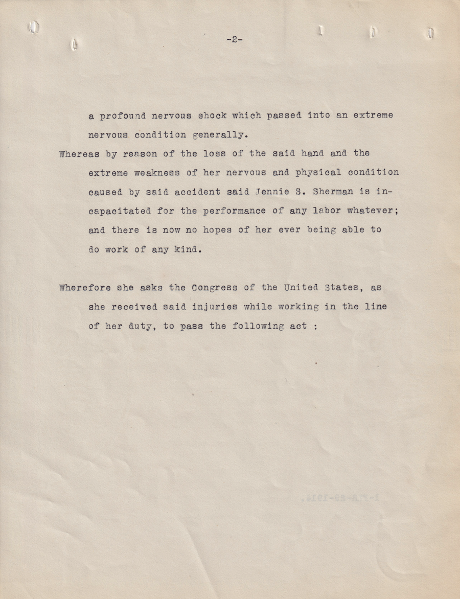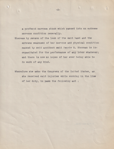 This resolution is for the relief of an accident that caused Jennie S. Sherman to lose her arm and her request for relief from the government.Identifier: