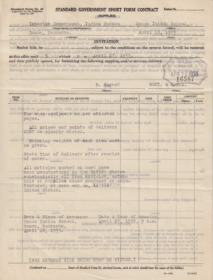 Contract from H. Bogard, 10 Apr. 1933; Folder: 16587-1933-420, Box 17; Central Classified Files, 1907–1939 (NAID 300324); Office of Indian Affairs; Record Group 75; National Archives and Records Administration-Washington, DC.