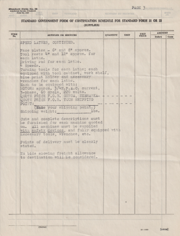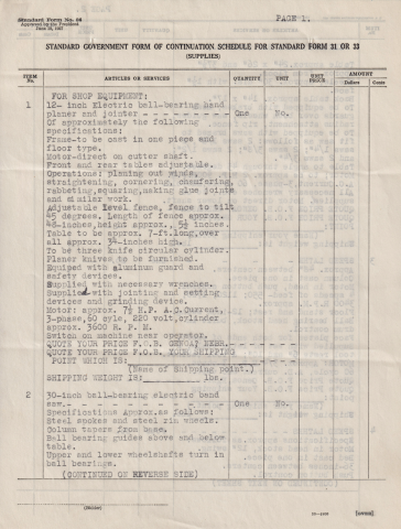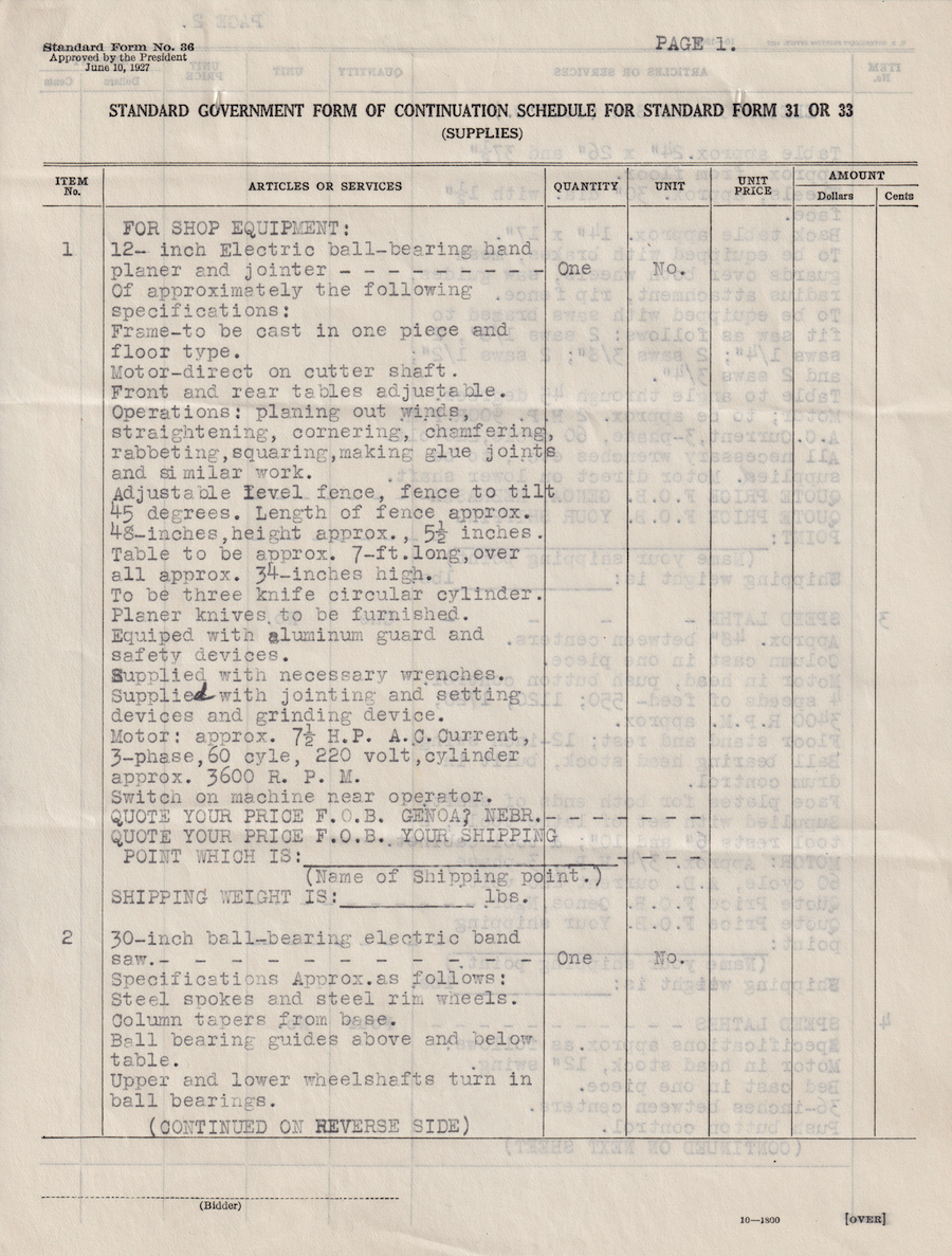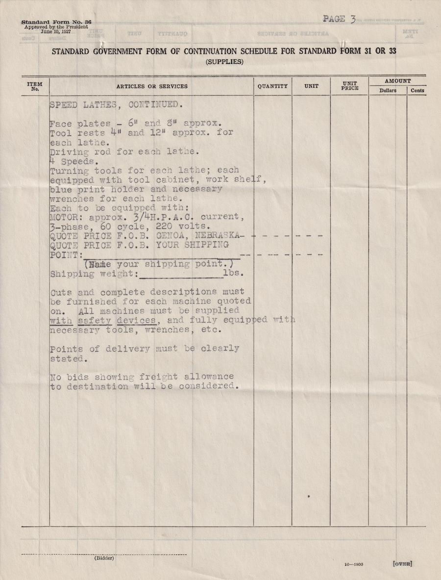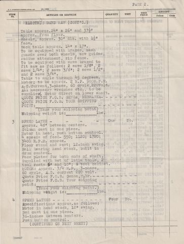 Regarding bids and quotes on shop equipment and general specifications for machine equipment, including weight for shipment.