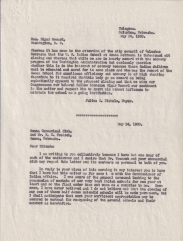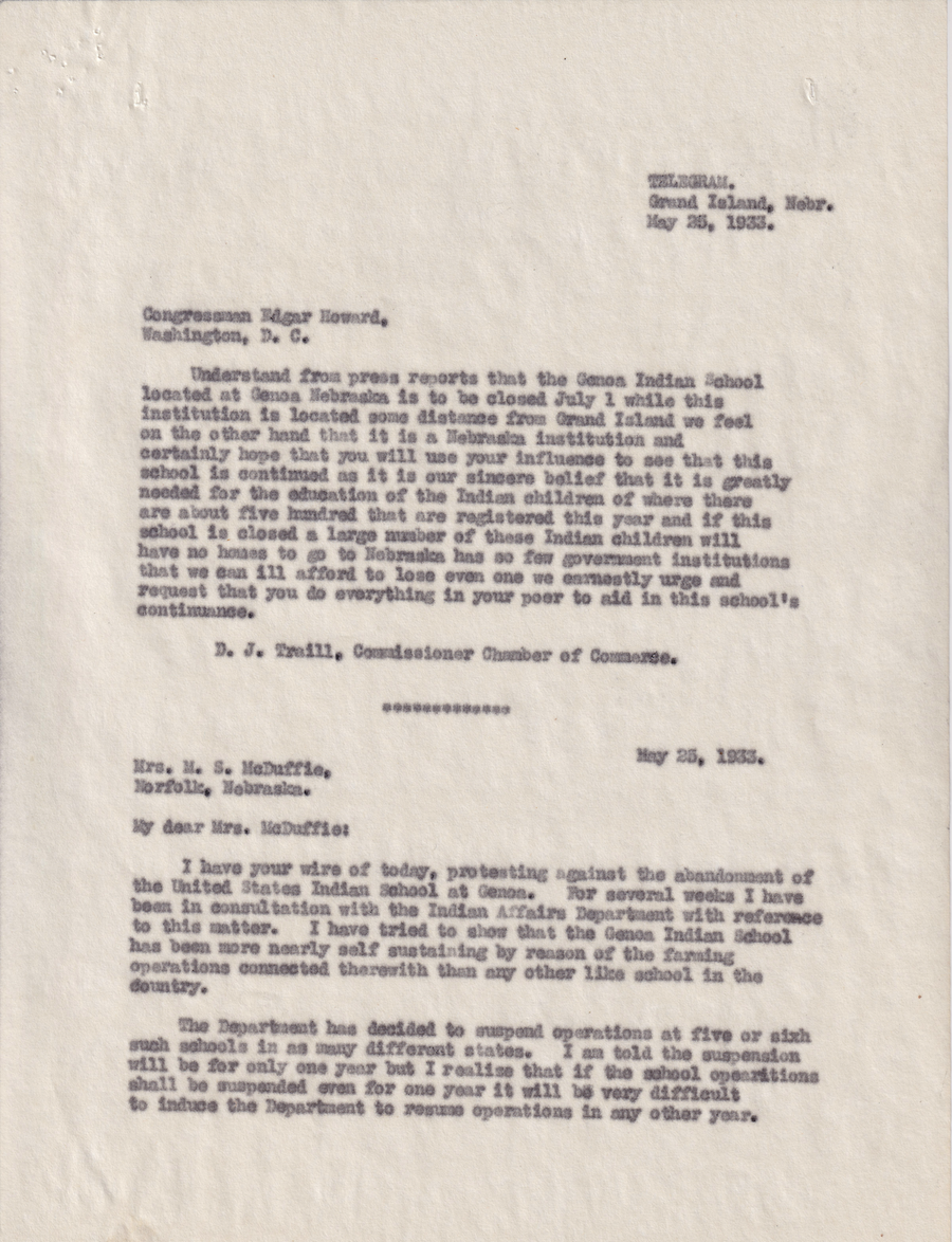 Copies of Telegrams, 24-25 May 1933; Folder: 45539-1930-800, Box 20; Central Classified Files, 1907–1939 (NAID 300324); Office of Indian Affairs; Record Group 75; National Archives and Records Administration-Washington, DC.