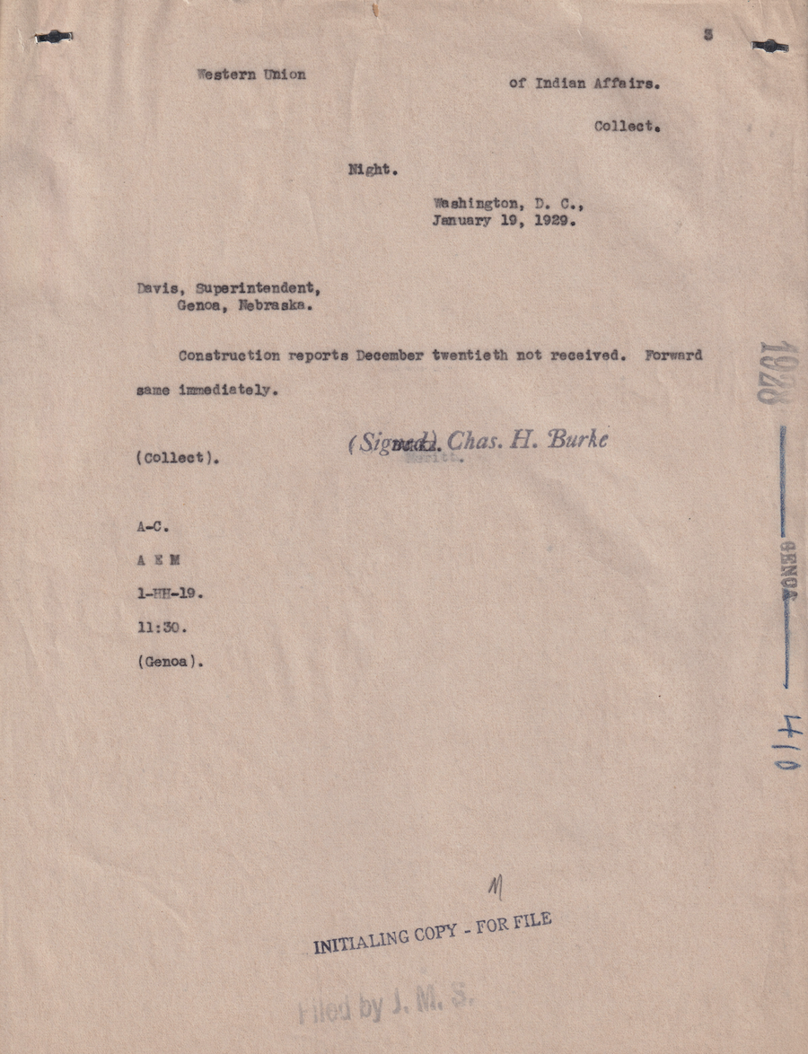Draft Telegram from Chas. H. Burke to Superintendent Davis, 19 Jan. 1929; Folder: 00-1928-410, Box 17; Central Classified Files, 1907–1939 (NAID 300324); Office of Indian Affairs; Record Group 75; National Archives and Records Administration-Washington, DC.