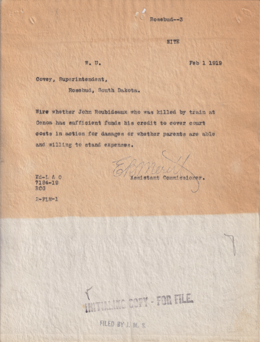Draft Telegram from E. B. Meritt to Superintendent Covey, 1 Feb. 1919; Folder: