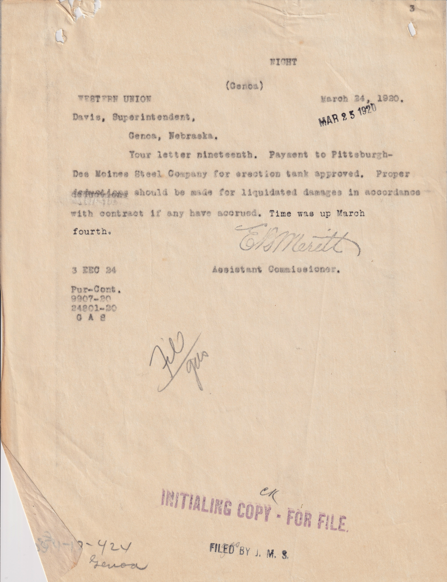 Draft Telegram from E. B. Meritt to Superintendent Davis, 24 Mar. 1920; Folder: 83054-1917-424, Box 17; Central Classified Files, 1907–1939 (NAID 300324); Office of Indian Affairs; Record Group 75; National Archives and Records Administration-Washington, DC.