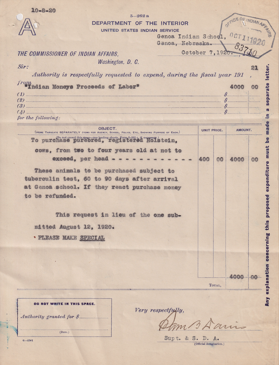 Expenditure form from Sam B. Davis, 7 Oct. 1920; Folder: 102442-1917-733, Box 19; Central Classified Files, 1907–1939 (NAID 300324); Office of Indian Affairs; Record Group 75; National Archives and Records Administration-Washington, DC.