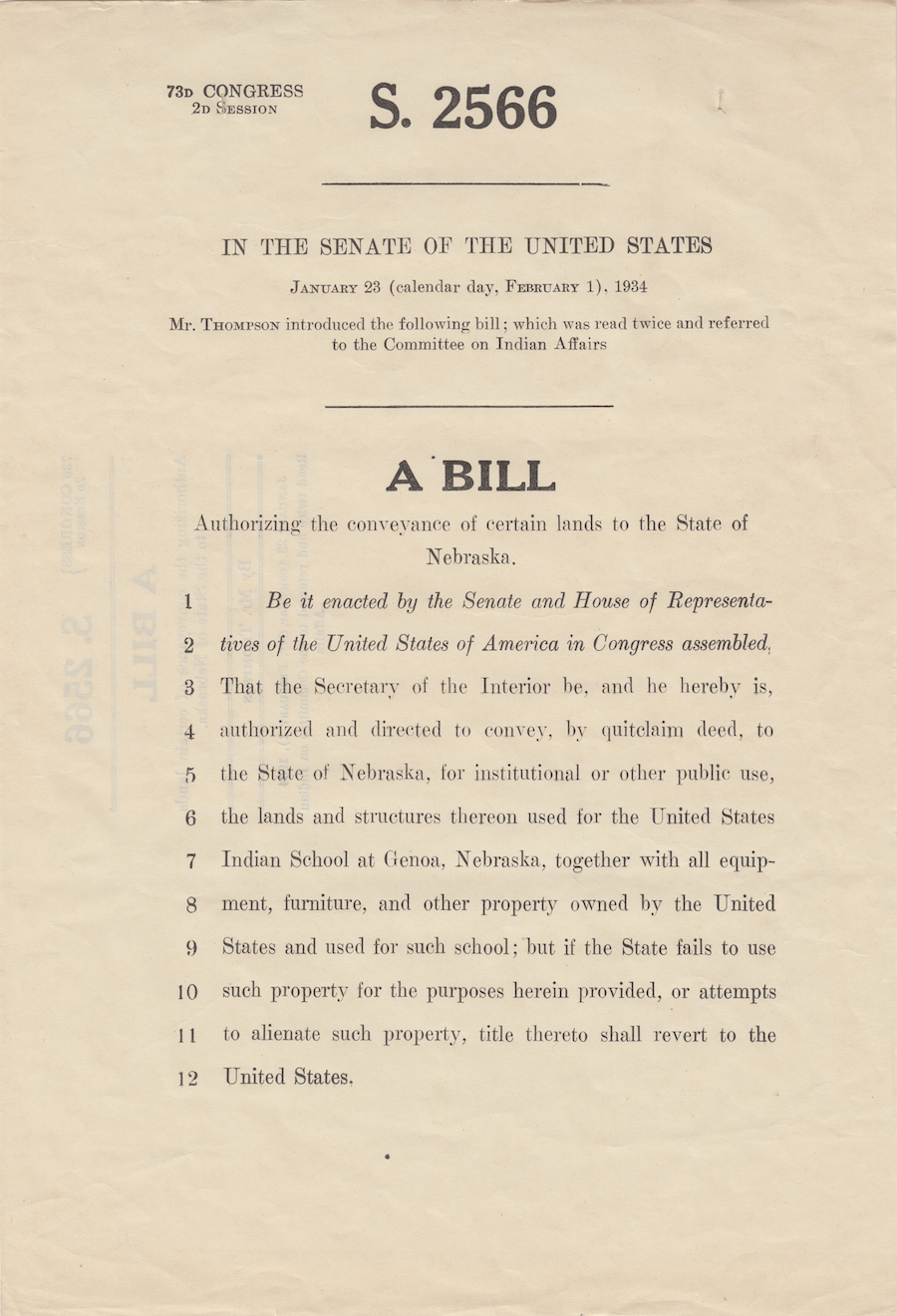 Bill conveying lands and structures associated with the Genoa Indian School to the State of Nebraska.Identifier: