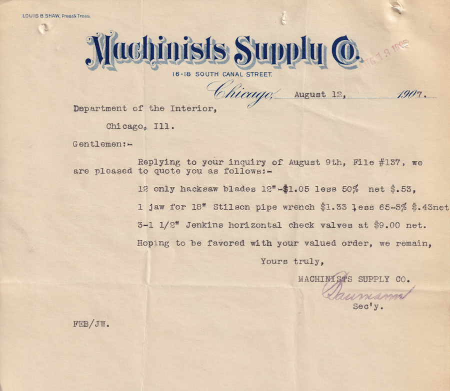 Regarding an itemized quote for saw blades, a jaw for a pipe wrench, and check valves.Identifier: