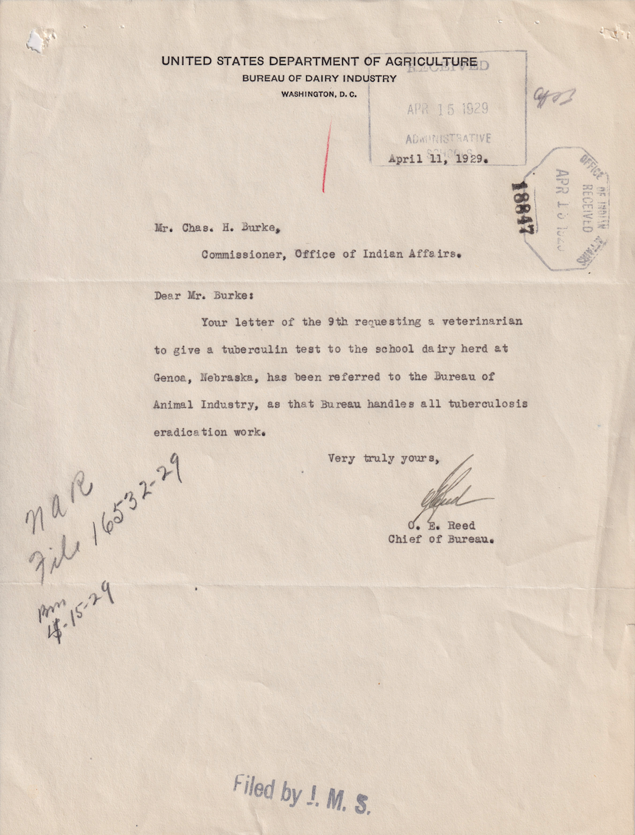 Letter from C. E. Reed to Charles H. Burke, 11 Apr. 1929; Folder: 16532-1929-733, Box 20; Central Classified Files, 1907–1939 (NAID 300324); Office of Indian Affairs; Record Group 75; National Archives and Records Administration-Washington, DC.