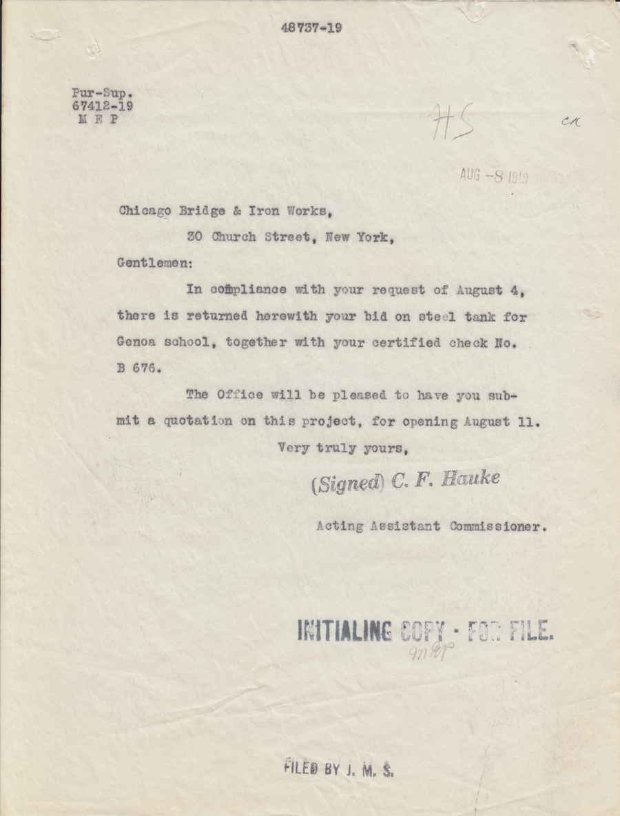 Letter from C. F. Hauke to Chicago Bridge & Iron Works, 8 Aug. 1919; Folder: 83054-1917-424, Box 17; Central Classified Files, 1907–1939 (NAID 300324); Office of Indian Affairs; Record Group 75; National Archives and Records Administration-Washington, DC.