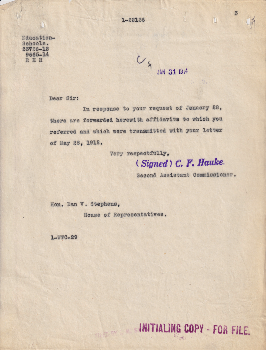 Letter from C. F. Hauke to Dan V. Stephens, 31 Jan. 1914; Folder: 53726-1912-732, Box 19; Central Classified Files, 1907–1939 (NAID 300324); Office of Indian Affairs; Record Group 75; National Archives and Records Administration-Washington, DC.