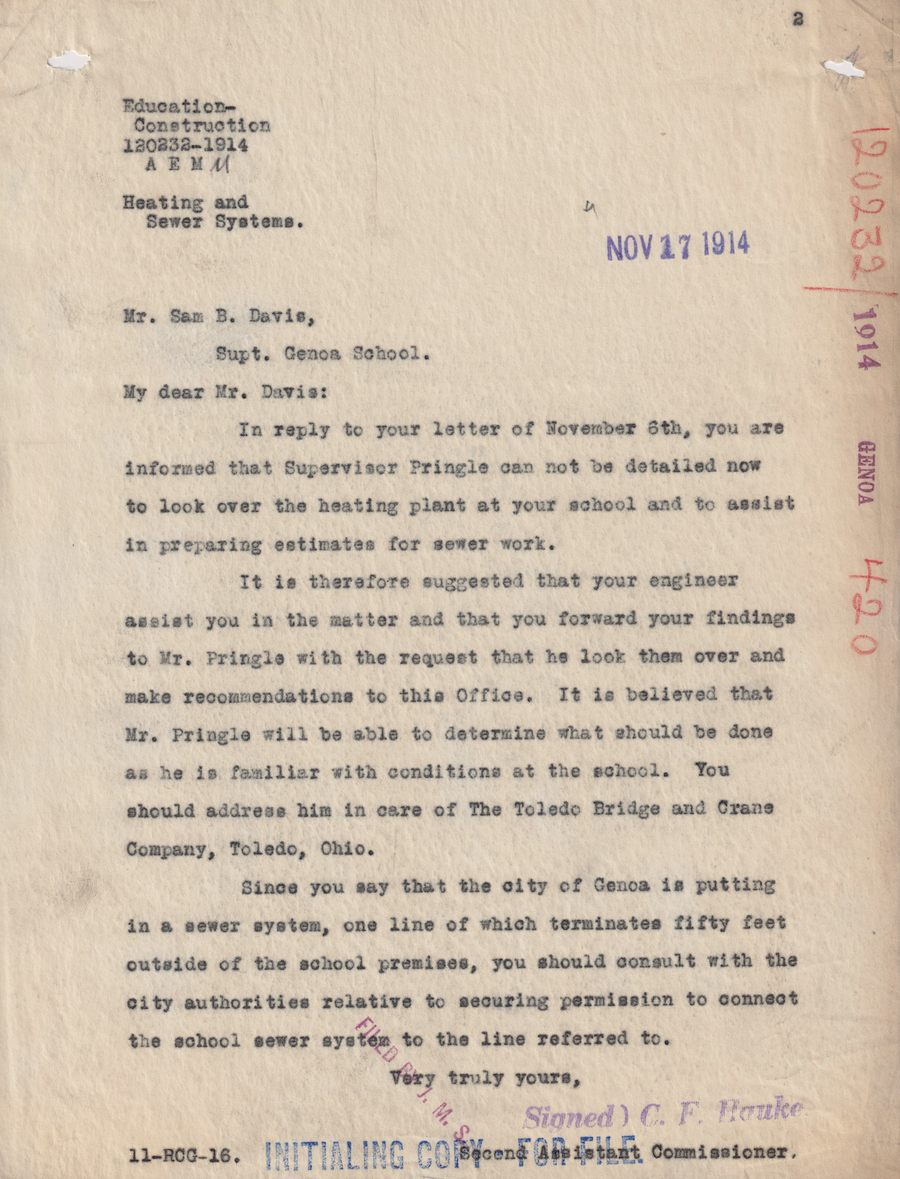 Letter from C. F. Hauke to Sam B. Davis, 17 Nov. 1914; Folder: 120232-1914-420, Box 17; Central Classified Files, 1907–1939 (NAID 300324); Office of Indian Affairs; Record Group 75; National Archives and Records Administration-Washington, DC.