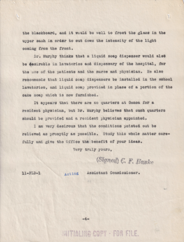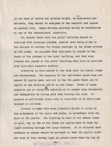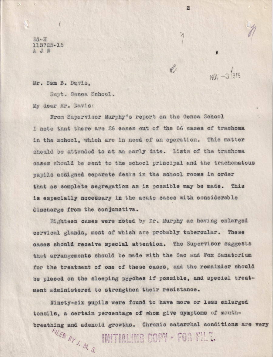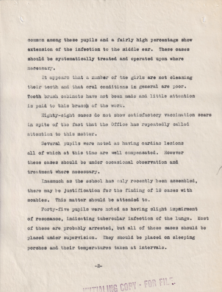 This letter states that there were 66 cases of trachoma; 26 of these cases were in need of operation. There were 8 cases of enlarged cervical glands, most of which were probably tubercular. Ninety-six pupils were found to have enlarged tonsils. Eighty-eight students did not show satisfactory vaccination scars. Forty-five pupils were noted as having tubercular infection of the lungs.