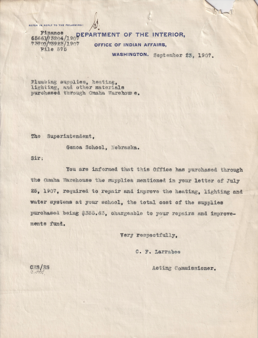 Letter from C. F. Larrabee to the superintendent, 23 Sept. 1907; Folder: 73700-1907-420, Box 17; Central Classified Files, 1907–1939 (NAID 300324); Office of Indian Affairs; Record Group 75; National Archives and Records Administration-Washington, DC.