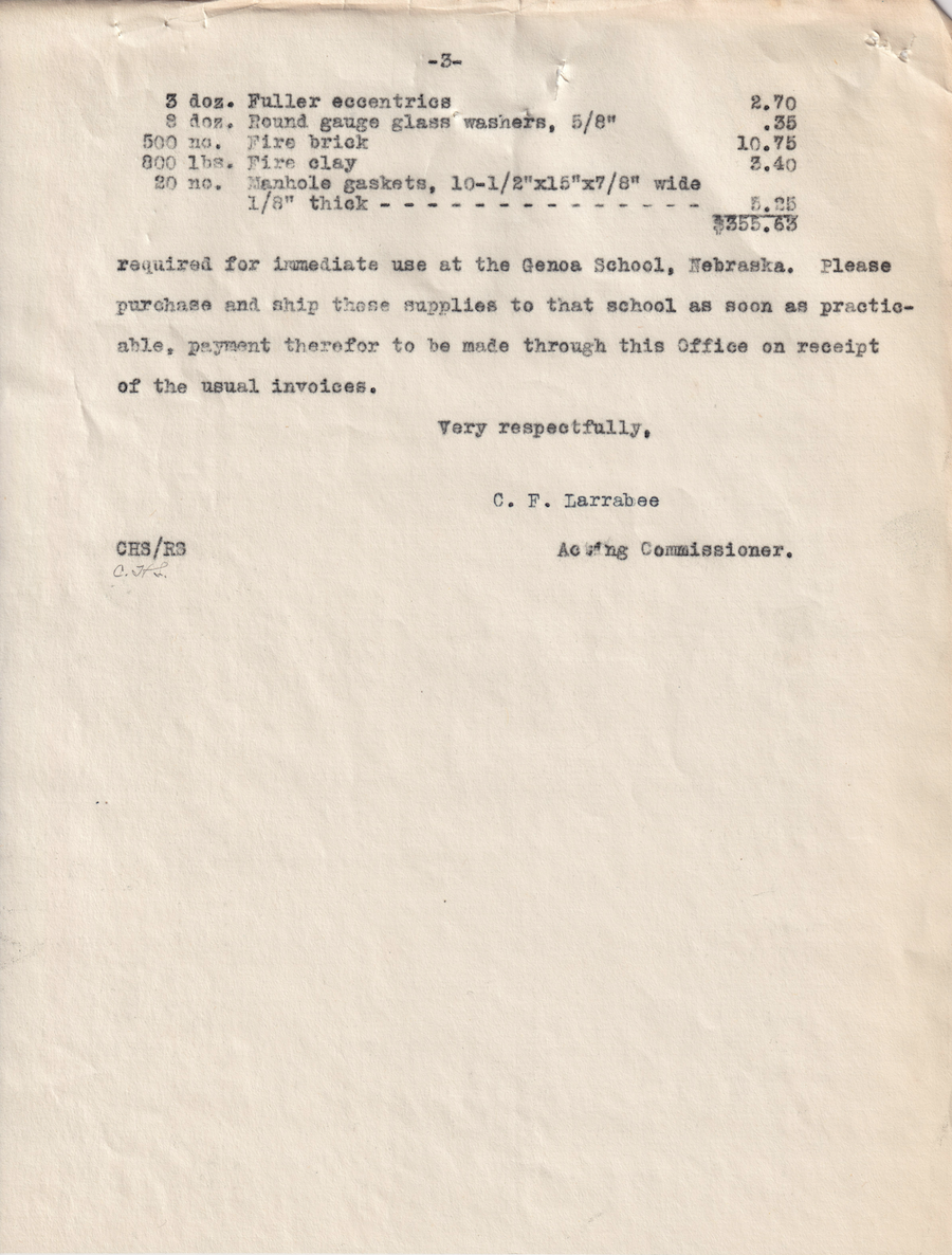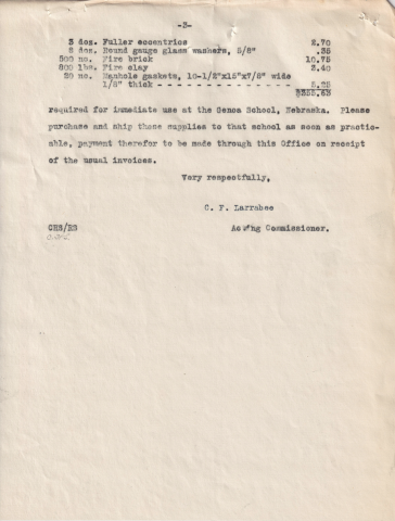 Letter from C. F. Larrabee to the superintendent, 23 Sept. 1907; Folder: 73700-1907-420, Box 17; Central Classified Files, 1907–1939 (NAID 300324); Office of Indian Affairs; Record Group 75; National Archives and Records Administration-Washington, DC.