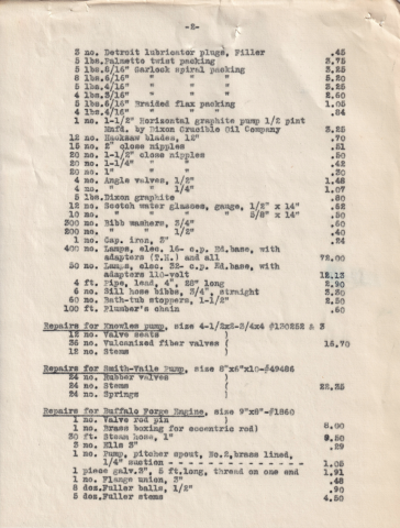 This letter has an itemized list of all purchases for repairing the steam pipes, knowles pump, smith-vaile pump, and buffalo forge engine.