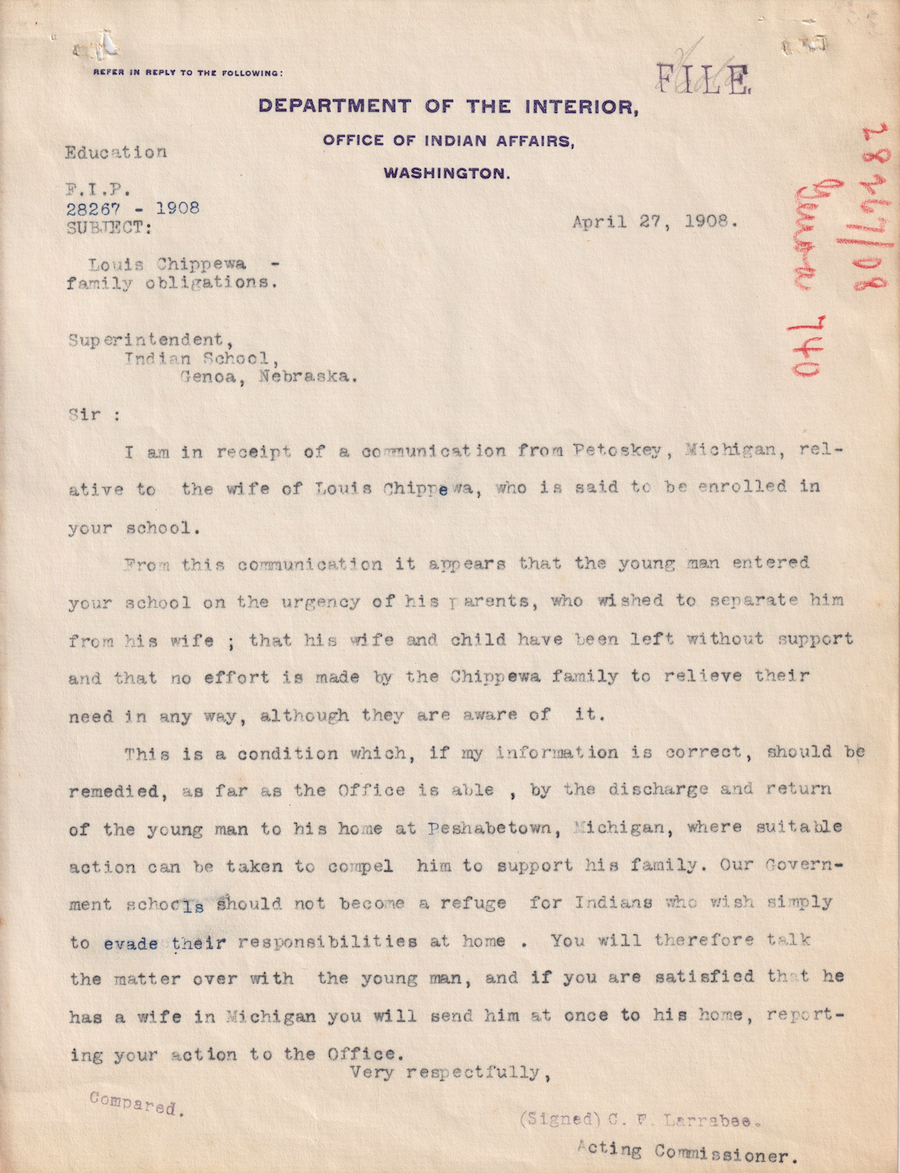 Letter from C. F. Larrabee to the superintendent, 27 Apr. 1908; Folder: 28267-1908-740, Box 20; Central Classified Files, 1907–1939 (NAID 300324); Office of Indian Affairs; Record Group 75; National Archives and Records Administration-Washington, DC.