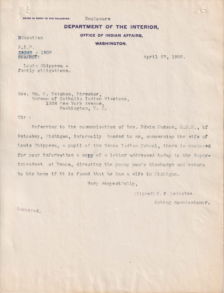 Letter from C. F. Larrabee to Wm. H. Ketcham, 27 Apr. 1908; Folder: 28267-1908-740, Box 20; Central Classified Files, 1907–1939 (NAID 300324); Office of Indian Affairs; Record Group 75; National Archives and Records Administration-Washington, DC.