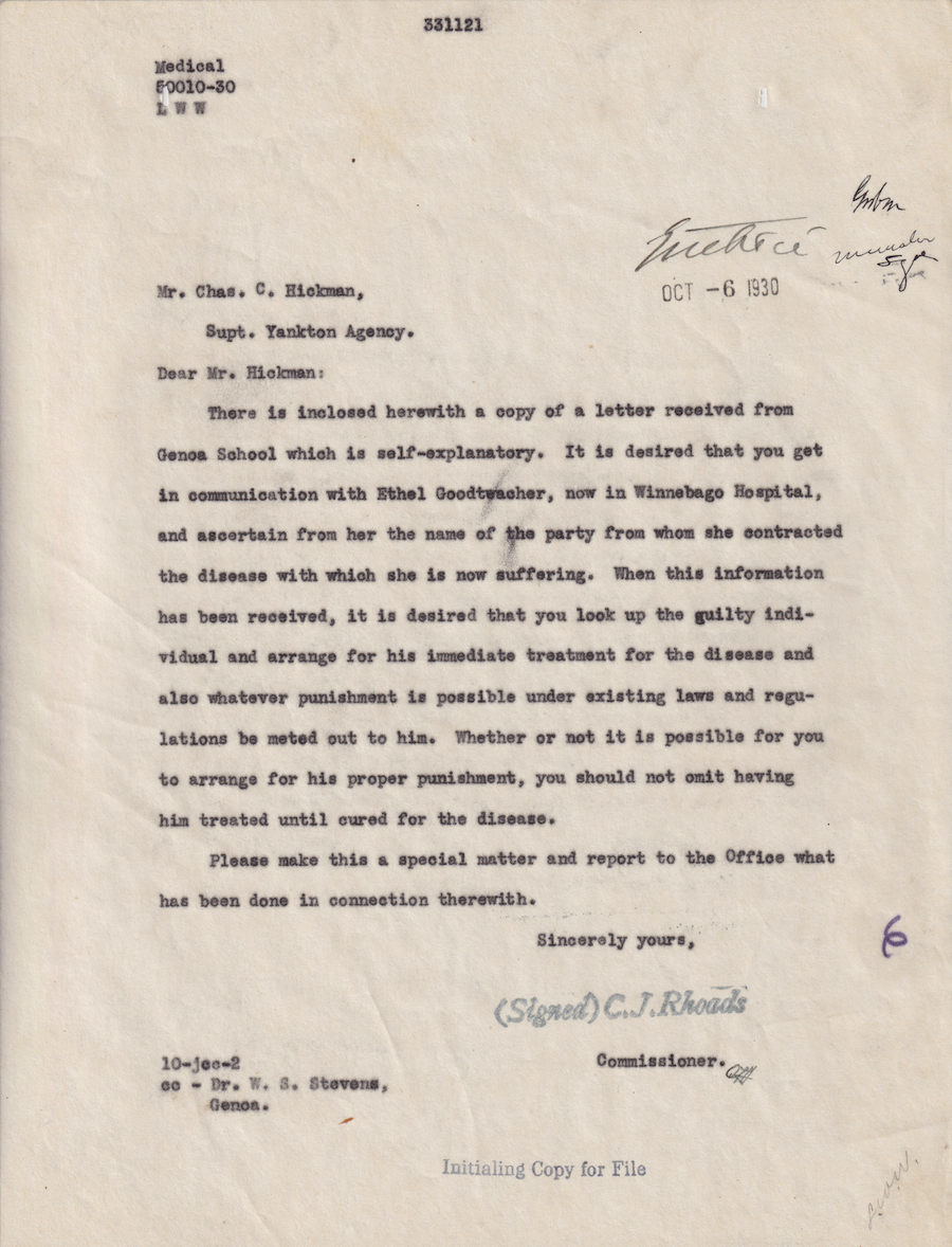 Letter from C. J. Rhoads to Chas C. Hickman, 6 Oct. 1930; Folder: 50010-1930-732, Box 19; Central Classified Files, 1907–1939 (NAID 300324); Office of Indian Affairs; Record Group 75; National Archives and Records Administration-Washington, DC.