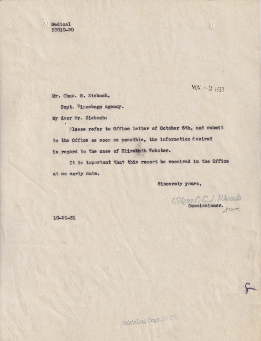 Letter from C. J. Rhoads to Chas M. Ziebach, 3 Nov. 1930; Folder: 50010-1930-732, Box 19; Central Classified Files, 1907–1939 (NAID 300324); Office of Indian Affairs; Record Group 75; National Archives and Records Administration-Washington, DC.