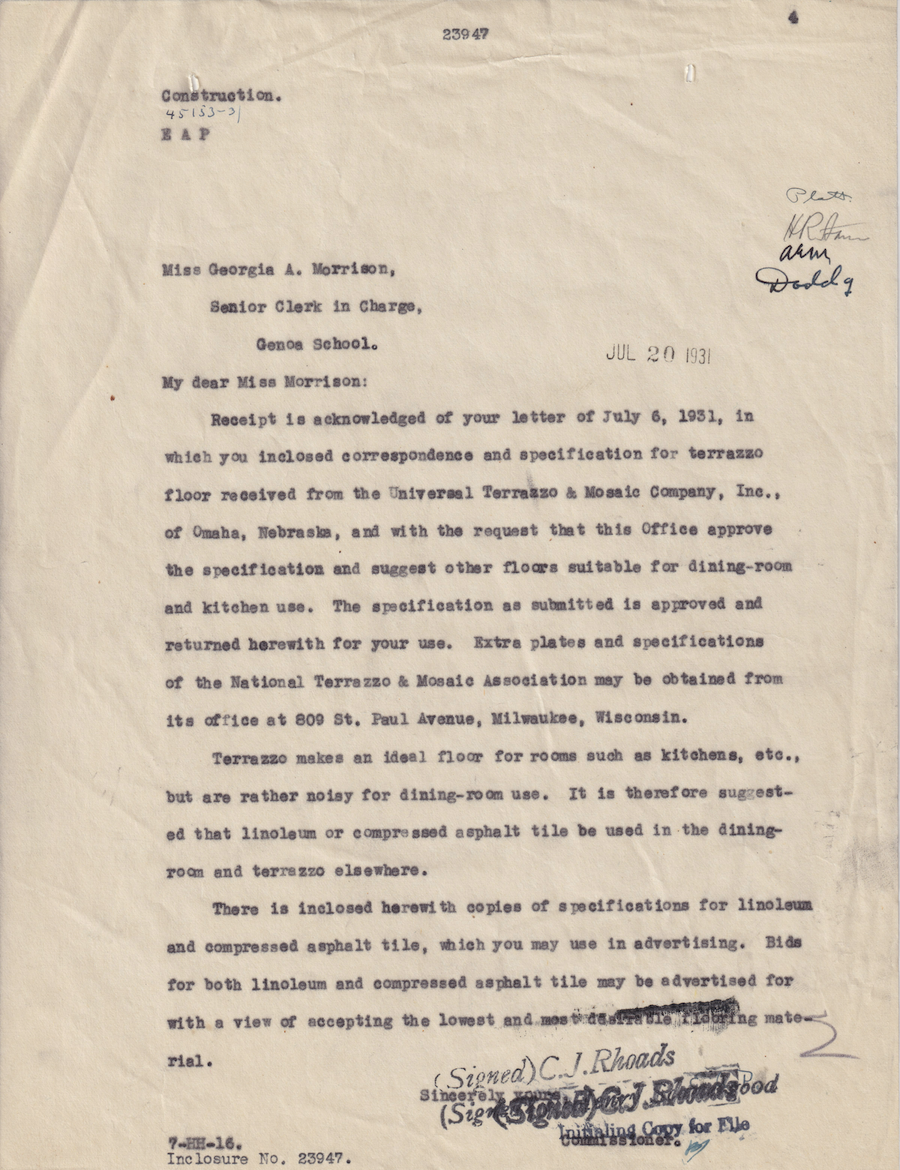 Regarding terrazzo flooring for the kitchen and advertising for linoleum for the dining room floor.Identifier: