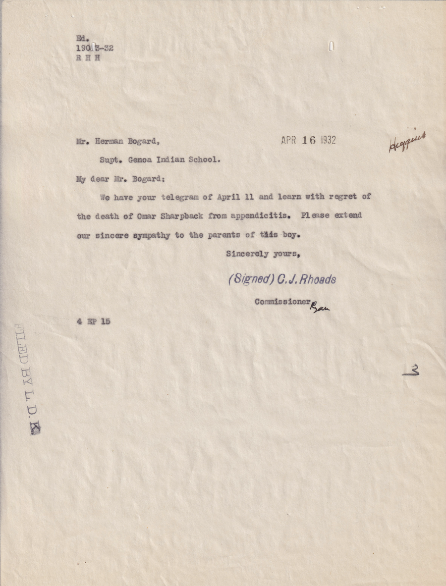 Letter from C. J. Rhoads to Herman Bogard, 16 Apr. 1932; Folder: 19083-1932-736, Box 20; Central Classified Files, 1907–1939 (NAID 300324); Office of Indian Affairs; Record Group 75; National Archives and Records Administration-Washington, DC.