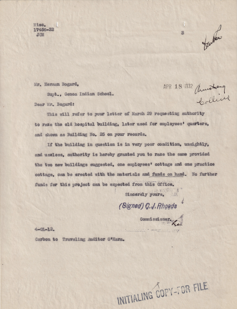 Letter from C. J. Rhoads to Herman Bogard, 18 Apr. 1932; Folder: 17456-1932-410, Box 17; Central Classified Files, 1907–1939 (NAID 300324); Office of Indian Affairs; Record Group 75; National Archives and Records Administration-Washington, DC.