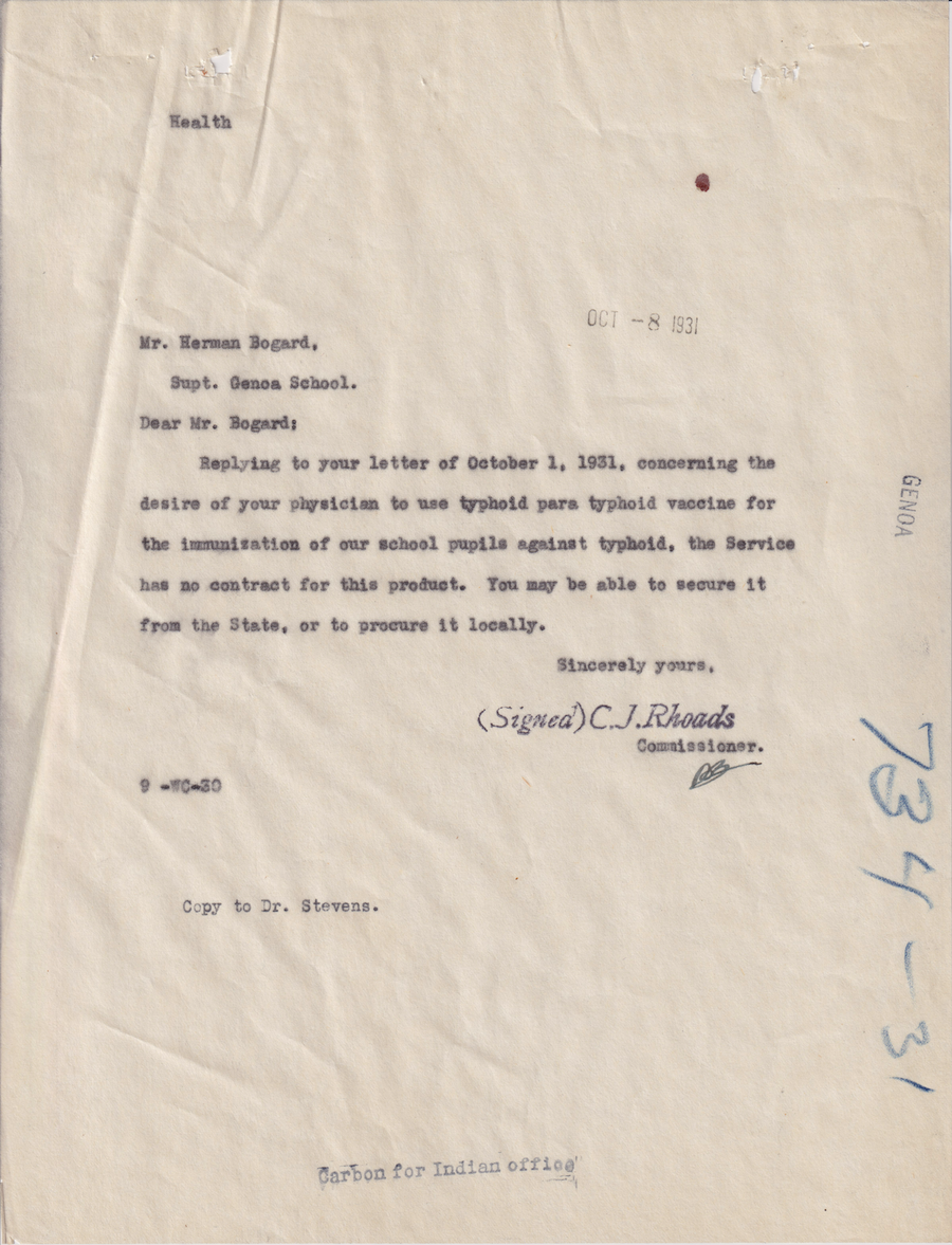 Letter from C. J. Rhoads to Herman Bogard, 8 Oct. 1931; Folder: 00-1931-734, Box 20; Central Classified Files, 1907–1939 (NAID 300324); Office of Indian Affairs; Record Group 75; National Archives and Records Administration-Washington, DC.