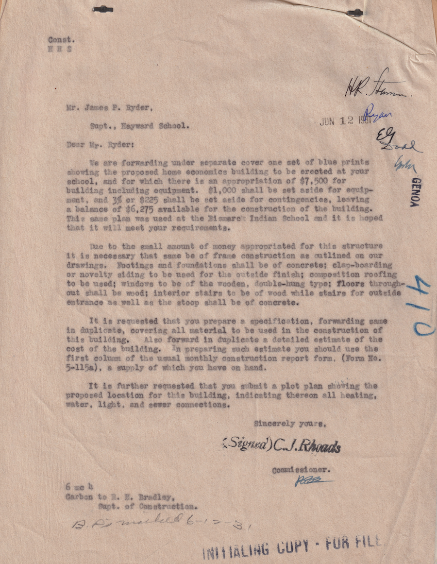 Letter from C. J. Rhoads to James P. Ryder, 12 June 1931; Folder: 00-1931-410, Box 17; Central Classified Files, 1907–1939 (NAID 300324); Office of Indian Affairs; Record Group 75; National Archives and Records Administration-Washington, DC.