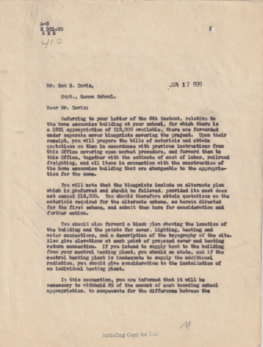 Regarding the construction and blueprints of the home economics building, including $15,000 in appropriations available for the project.Identifier: