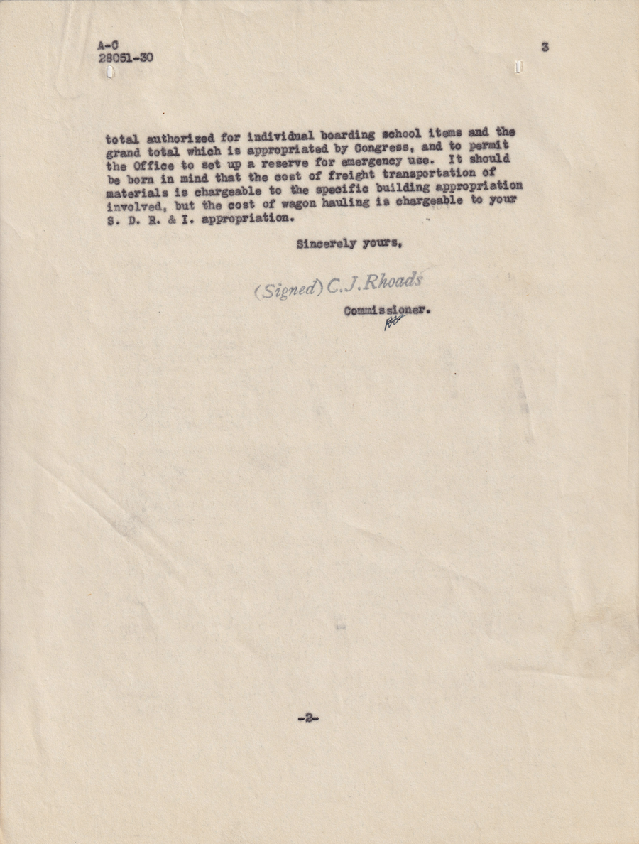 Letter from C. J. Rhoads to Sam B. Davis, 17 Jan. 1930; Folder: 28051-1930-410, Box 17; Central Classified Files, 1907–1939 (NAID 300324); Office of Indian Affairs; Record Group 75; National Archives and Records Administration-Washington, DC.