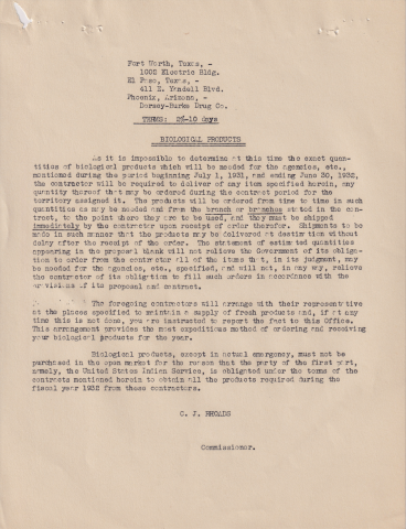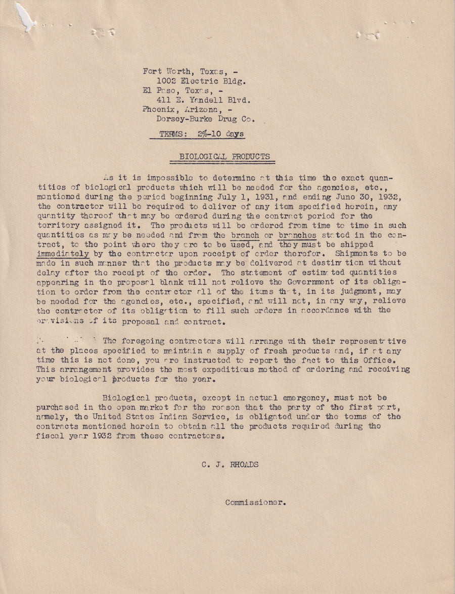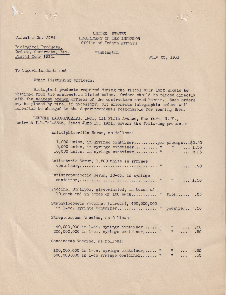Letter from C. J. Rhoads to superintendents, 23 July 1931; Folder: 00-1931-734, Box 20; Central Classified Files, 1907–1939 (NAID 300324); Office of Indian Affairs; Record Group 75; National Archives and Records Administration-Washington, DC.