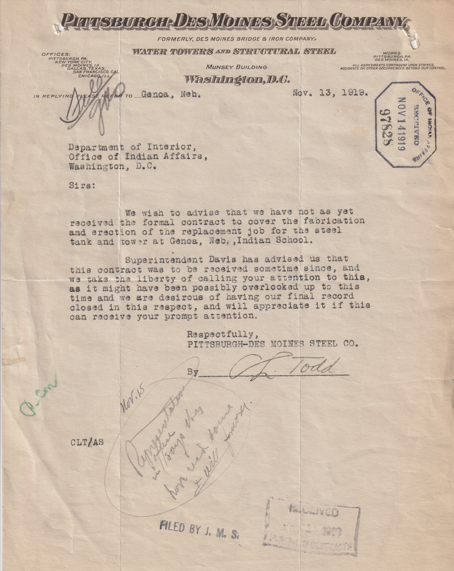 Letter from C. L. Todd to the Department of the Interior, 13 Nov. 1919; Folder: 83054-1917-424, Box 17; Central Classified Files, 1907–1939 (NAID 300324); Office of Indian Affairs; Record Group 75; National Archives and Records Administration-Washington, DC.