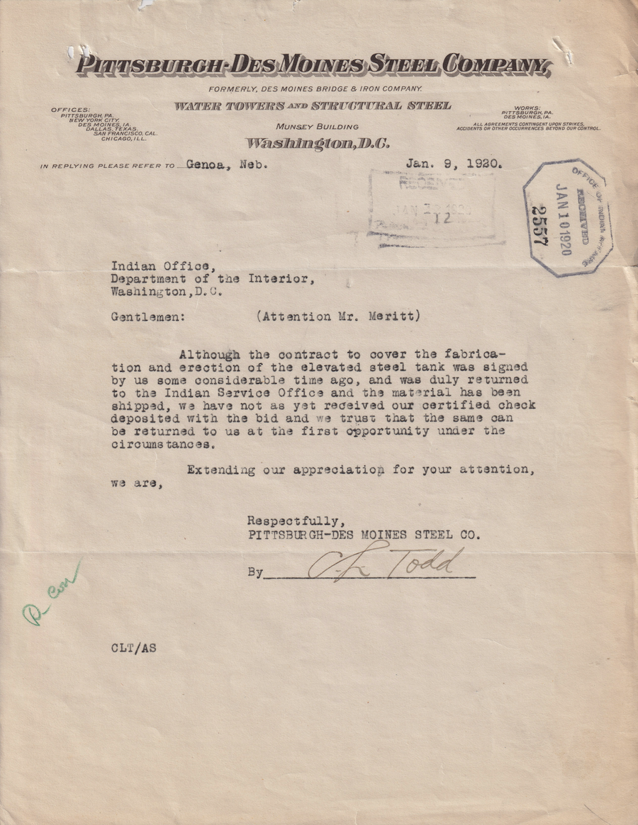 Letter from C. L. Todd to Mr. Meritt, 9 Jan. 1920; Folder: 83054-1917-424, Box 17; Central Classified Files, 1907–1939 (NAID 300324); Office of Indian Affairs; Record Group 75; National Archives and Records Administration-Washington, DC.