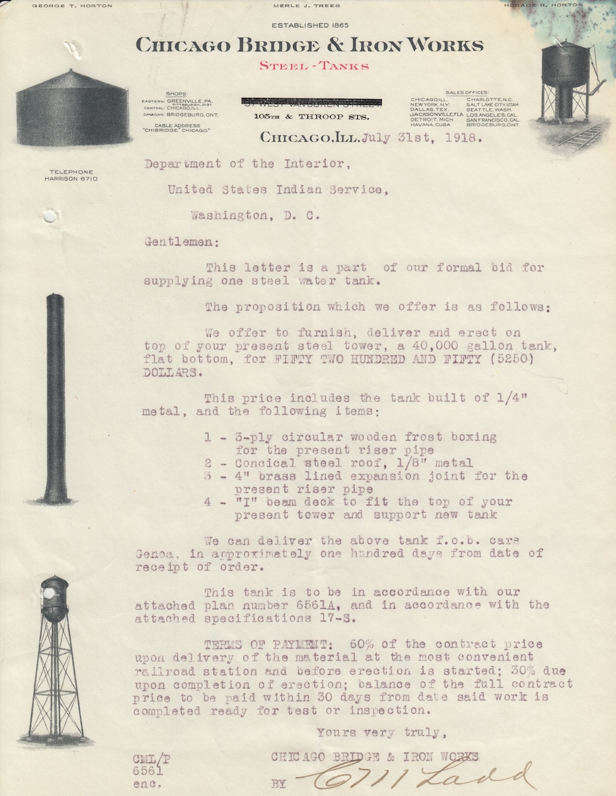 Letter from C. M. Ladd to the Department of the Interior, 31 July 1918; Folder: 83054-1917-424, Box 17; Central Classified Files, 1907–1939 (NAID 300324); Office of Indian Affairs; Record Group 75; National Archives and Records Administration-Washington, DC.