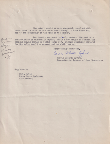 Regarding a report on the dormitories, home economics cottage, dining room, kitchen, bakery, and laundry.Identifier: