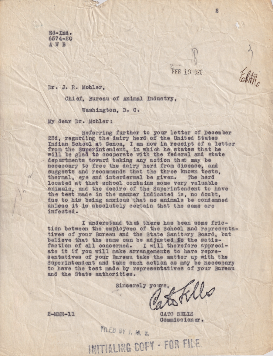 Letter from Cato Sells to J. R. Mohler, 19 Feb. 1920; Folder: 102442-1917-733, Box 19; Central Classified Files, 1907–1939 (NAID 300324); Office of Indian Affairs; Record Group 75; National Archives and Records Administration-Washington, DC.