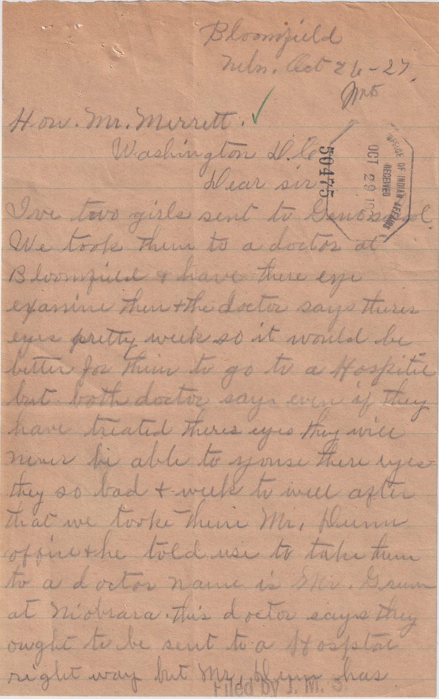 Letter from Charles Johnson to Mr. Meritt, 26 Oct. 1927; Folder: 50475-1927-734, Box 20; Central Classified Files, 1907–1939 (NAID 300324); Office of Indian Affairs; Record Group 75; National Archives and Records Administration-Washington, DC.