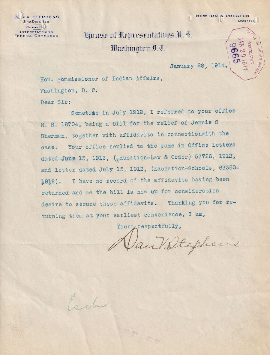 Letter from Dan V. Stephens to the Commissioner of Indian Affairs, 28 Jan. 1914; Folder: 53726-1912-732, Box 19; Central Classified Files, 1907–1939 (NAID 300324); Office of Indian Affairs; Record Group 75; National Archives and Records Administration-Washington, DC.