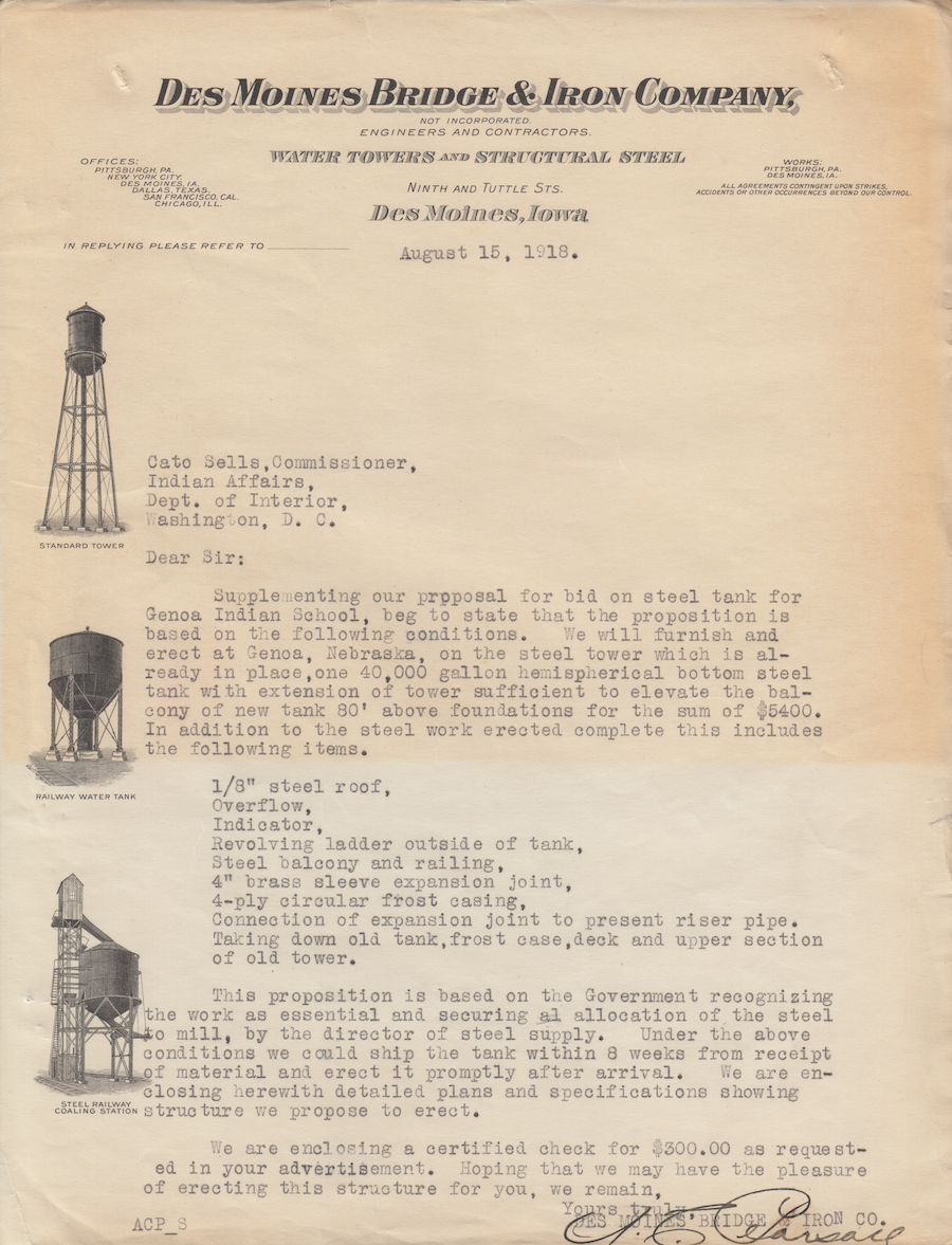 Letter from Des Moines Bridge & Iron Company to Cato Sells, 15 Aug. 1918; Folder: 83054-1917-424, Box 17; Central Classified Files, 1907–1939 (NAID 300324); Office of Indian Affairs; Record Group 75; National Archives and Records Administration-Washington, DC.