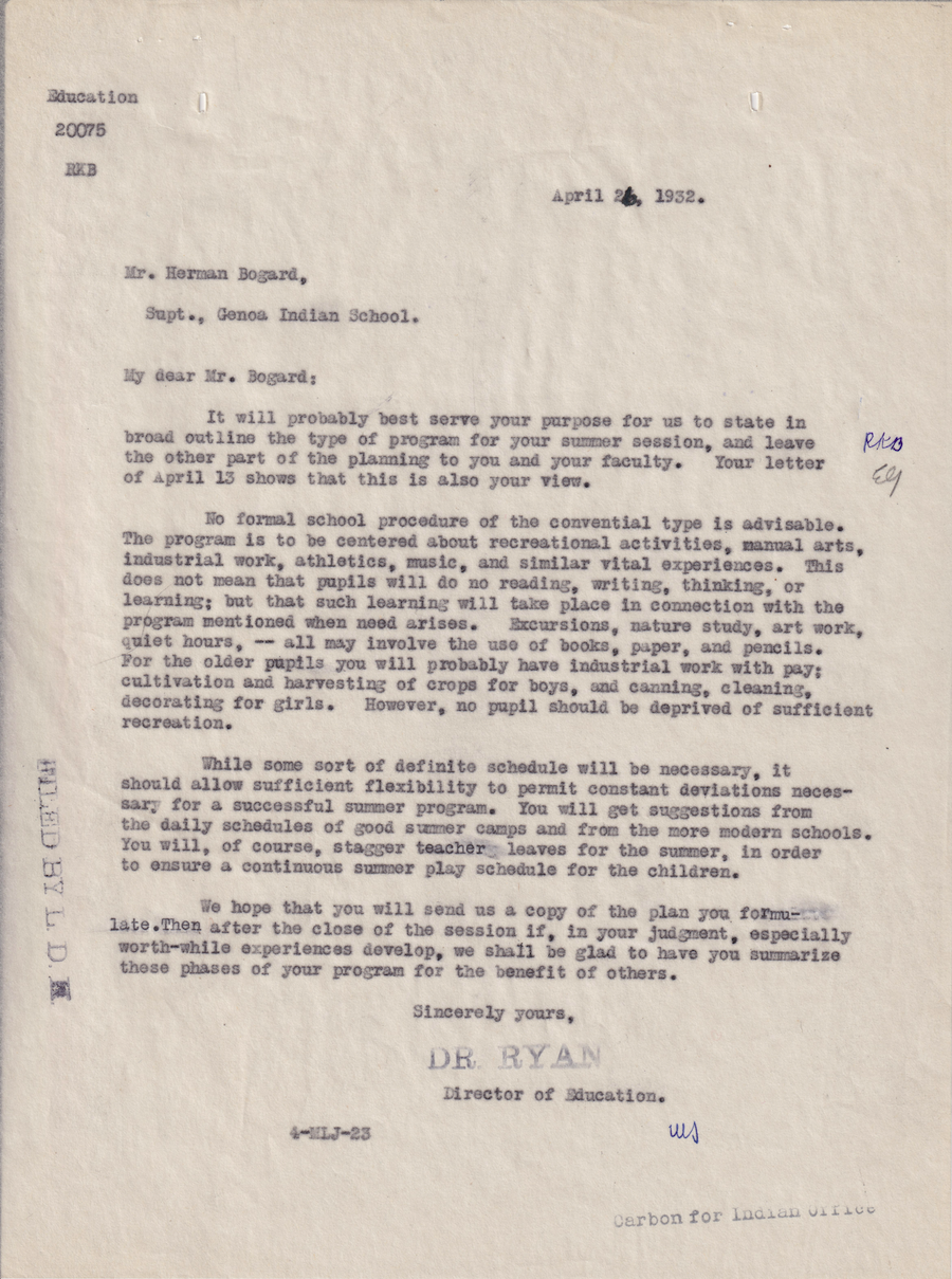 Letter from Dr. Ryan to Herman Bogard, 26 Apr. 1932; Folder: 20075-1932-806, Box 21; Central Classified Files, 1907–1939 (NAID 300324); Office of Indian Affairs; Record Group 75; National Archives and Records Administration-Washington, DC.