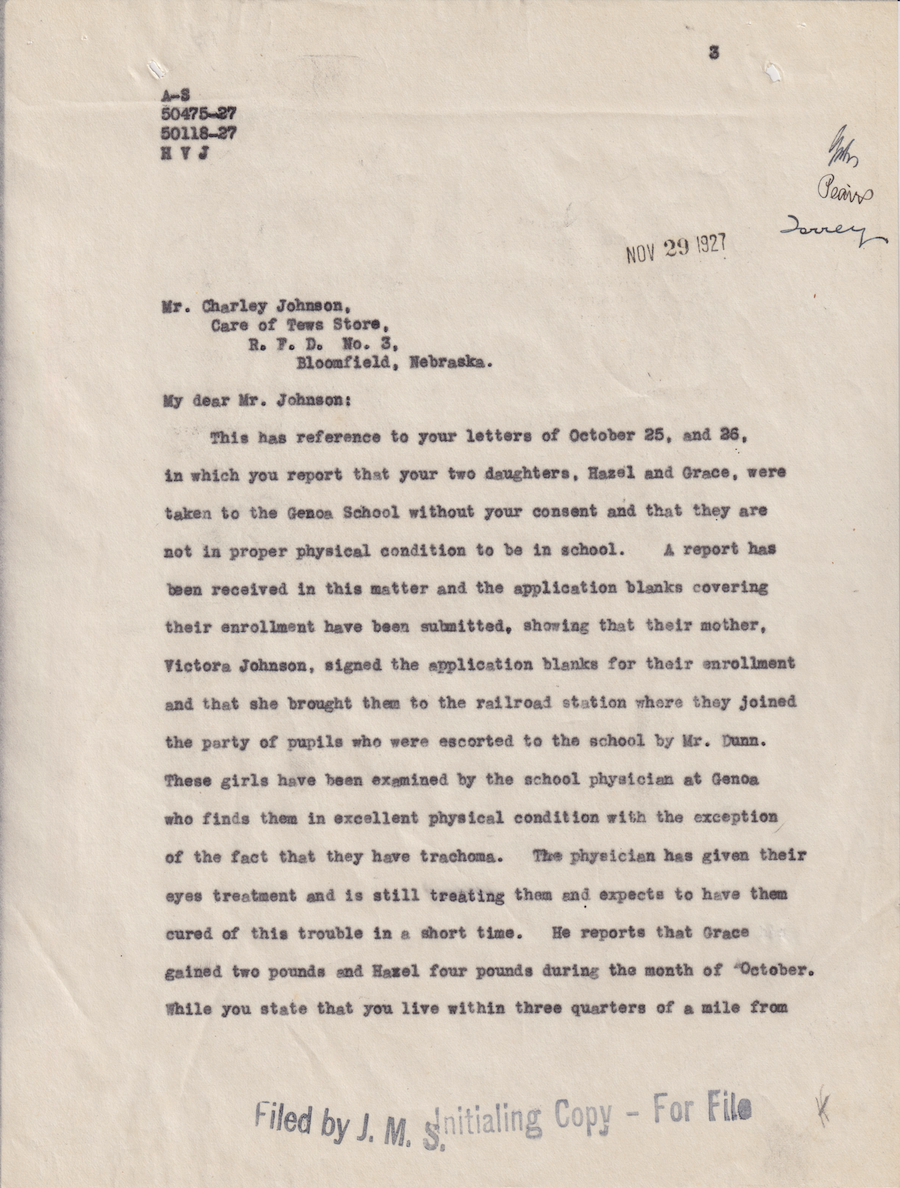 Letter from E. B. Meritt to Charley Johnson, 29 Nov. 1927; Folder: 50475-1927-734, Box 20; Central Classified Files, 1907–1939 (NAID 300324); Office of Indian Affairs; Record Group 75; National Archives and Records Administration-Washington, DC.