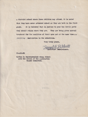 Regarding two girls taken to the Genoa school without consent who are being treated for trachoma.Identifier: