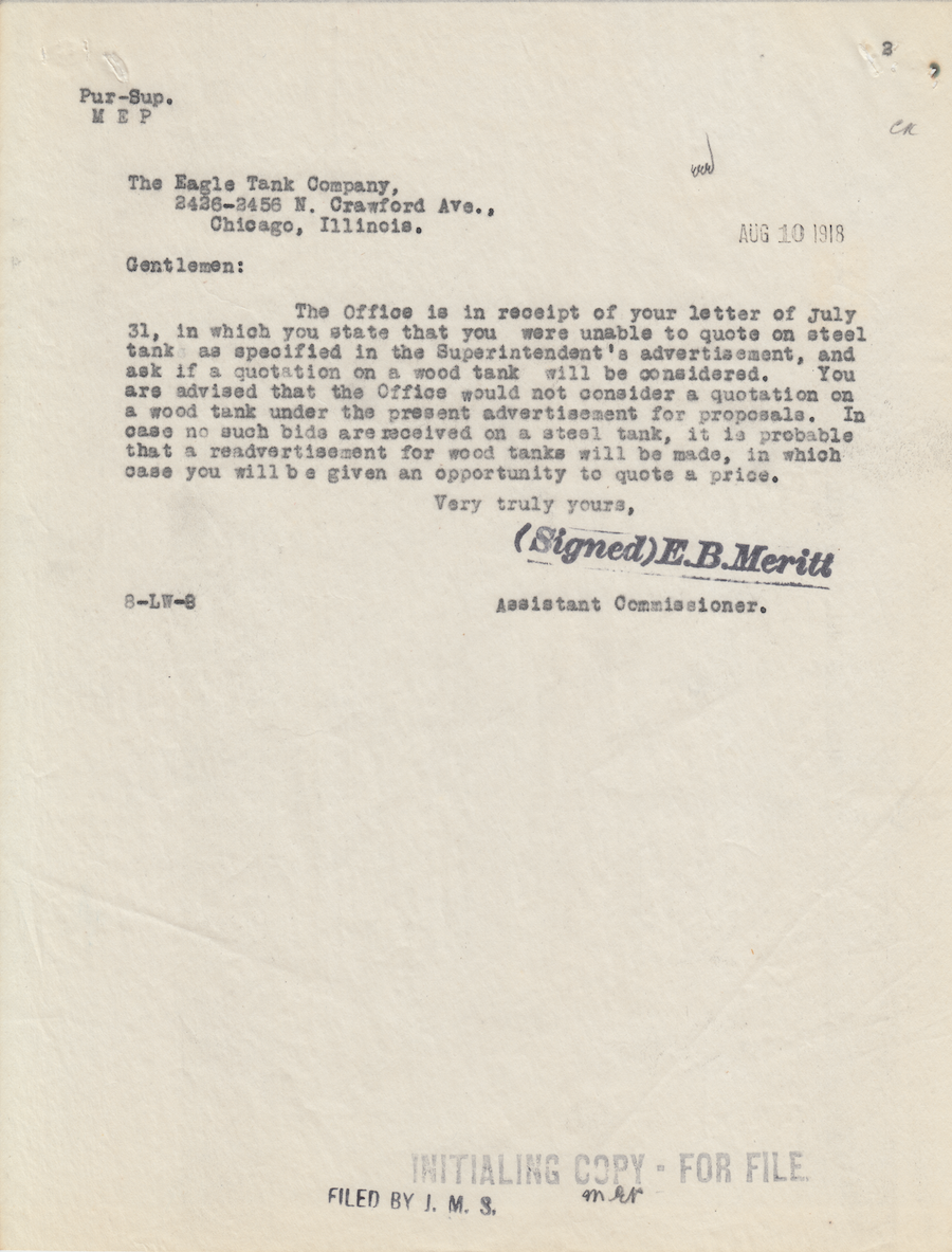 Letter from E. B. Meritt to the Eagle Tank Company, 10 Aug. 1918; Folder: 83054-1917-424, Box 17; Central Classified Files, 1907–1939 (NAID 300324); Office of Indian Affairs; Record Group 75; National Archives and Records Administration-Washington, DC.