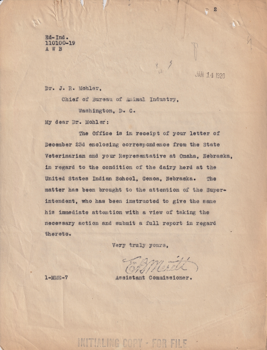 Letter from E. B. Meritt to J. R. Mohler, 14 Jan. 1920; Folder: 102442-1917-733, Box 19; Central Classified Files, 1907–1939 (NAID 300324); Office of Indian Affairs; Record Group 75; National Archives and Records Administration-Washington, DC.