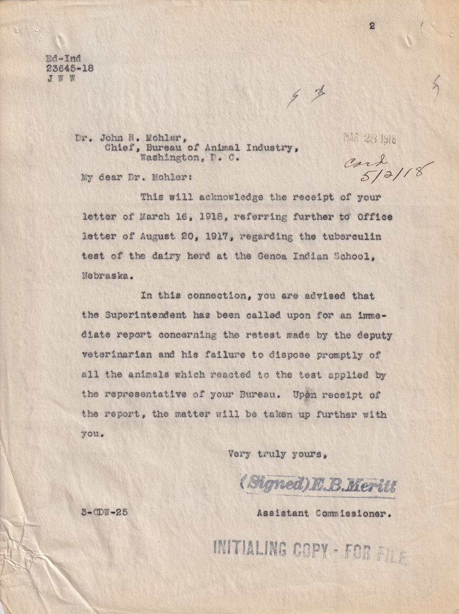 Letter from E. B. Meritt to John R. Mohler, 28 Mar. 1918; Folder: 102442-1917-733, Box 19; Central Classified Files, 1907–1939 (NAID 300324); Office of Indian Affairs; Record Group 75; National Archives and Records Administration-Washington, DC.